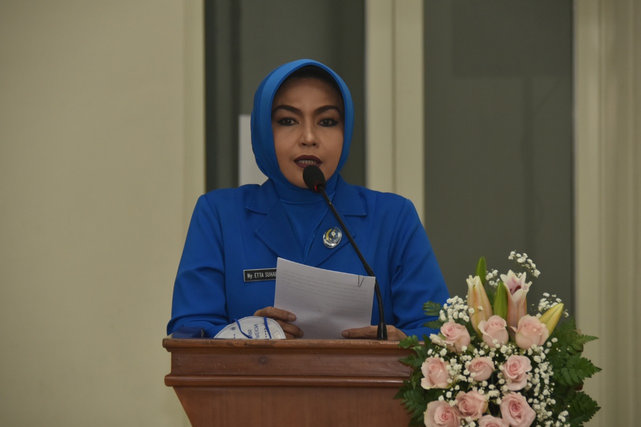 Ketua Gabungan Jalasenastri Kodiklatal Ny. Etta Suhartono saat memberi sambutan menyampaikan ucapan terimakasih kepada para juri serta Ketua Cabang 1 sampai dengan 7 bersama pengurus dan anggotanya yang sudah berpartisipasi dalam kegiatan hari pendidikan TNI Angkatan Laut tahun ini.