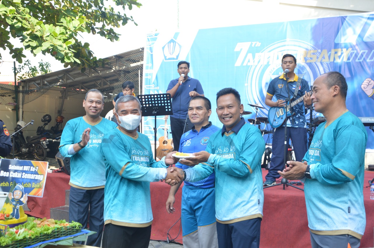 Komandan Pangkalan TNI Angkatan Laut (Danlanal) Semarang Kolonel Mar Haryono Masturi, M. Tr. Hanla, M.M., didampingi beberapa Perwira Staf mengikuti gowes gembira dalam rangka HUT Kantor Pengawasan dan Pelayanan Bea Cukai (KPPBC) Kota Semarang yang ke-7. Jum’at (1/7/2022).