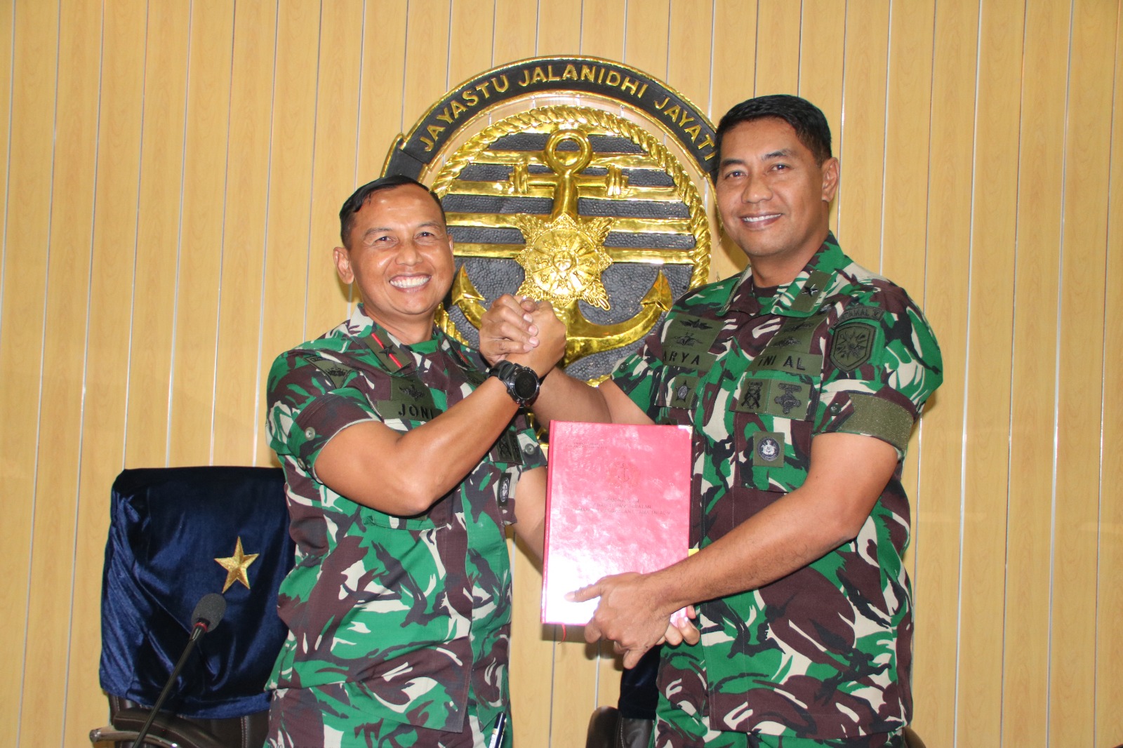 Komandan Pangkalan Utama TNI AL (Danlantamal) V melaksanakan pembacaan memorandum serah terima jabatan (Sertijab) Danlantamal V dari Brigjen TNI (Mar) Joni Sulistiawan, S.H., M.Han kepada Laksamana Pertama TNI Dr. Arya Delano, S.E., M.Pd., M.Han di ruang rapat Mako Lantamal V, Perak, Surabaya. Jumat (04/10/24).