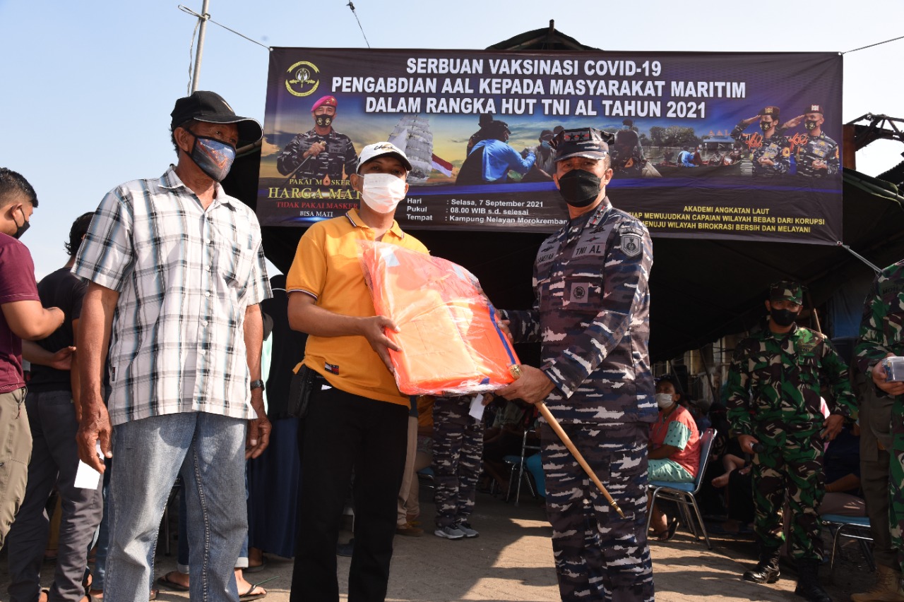 Serbuan Vaksinasi jelang HUT ke-76 TNI Angkatan Laut pada 10 September mendatang, Vaksinator Akademi Angkatan Laut menyasar masyarakat Kampung Nelayan Morokrembangan, Surabaya yang pelaksanaannya ditinjau Gubernur AAL, Mayjend TNI (Mar) Nur Alamsyah, S.E., M.M., M.Tr (Han). didampingi Ketua Cabang BS Jalasenastri AAL Ny. Ayu Nur Alamsyah, Selasa (7/9/2021).