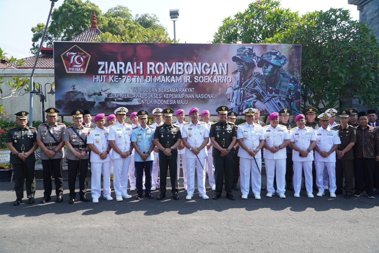Menjelang pemperingati HUT ke-79 TNI tahun 2024, Inspektur Puspenerbal, Kolonel Laut (T) Bambang Yunianto mewakili Komandan Puspenerbal, Laksda TNl Sisyani Jaffar beserta jajaran pejabat TNI Jawa Timur melaksanakan upacara ziarah di Makam Bung Karno, Sang Proklamator di Kota Blitar, Sabtu (28/9/2024).