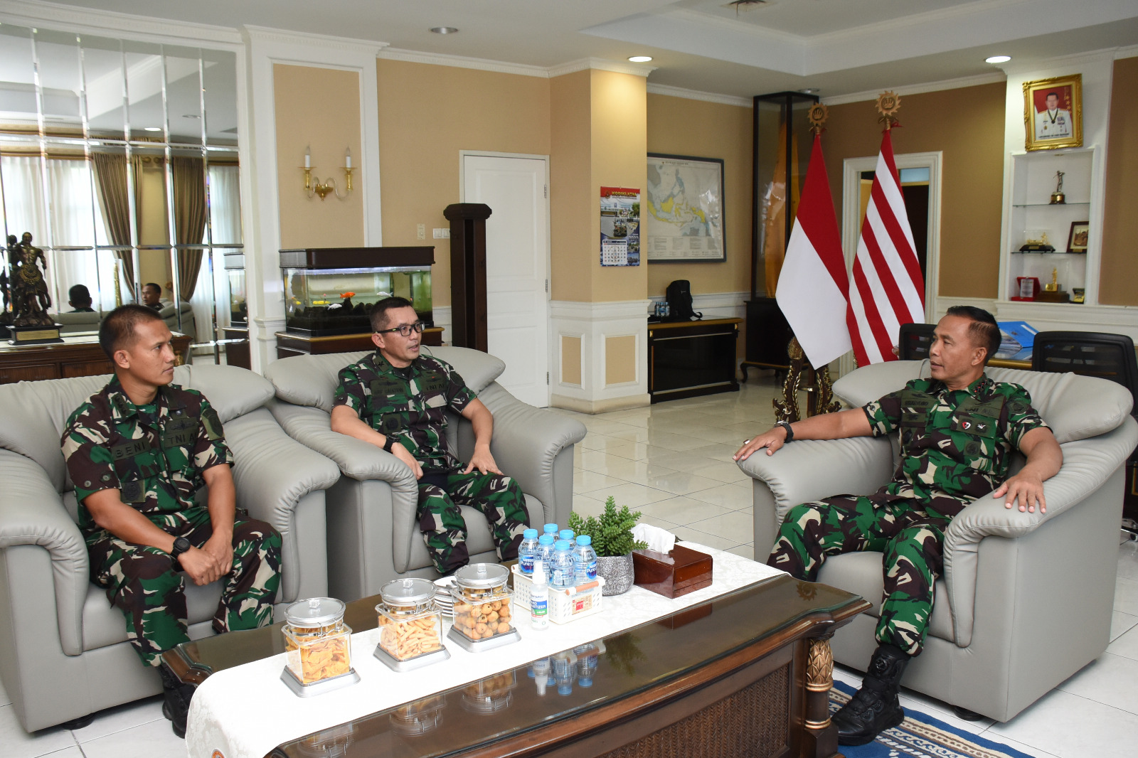Menjelang Sidang Penentuan Akhir (Pantukhir) Pendidikan Pembentukan Perwira (Diktukpa) TNI AL Angkatan LIII/2023, Komandan Komando Pembinaan Doktrin Pendidikan dan Latihan TNI AL (Dankodiklatal) Letjen TNI Marinir Suhartono didampingi Wadan Kodiklatal Laksda TNI Rachmad Jayadi menerima kunjungan Kepala Dinas Pendidikan Angkatan Laut (Kadisdikal) Laksma TNI Arif Badrudin di Ruang Kerja Dankodiklatal, Bumimoro Surabaya. Selasa, (14/03).