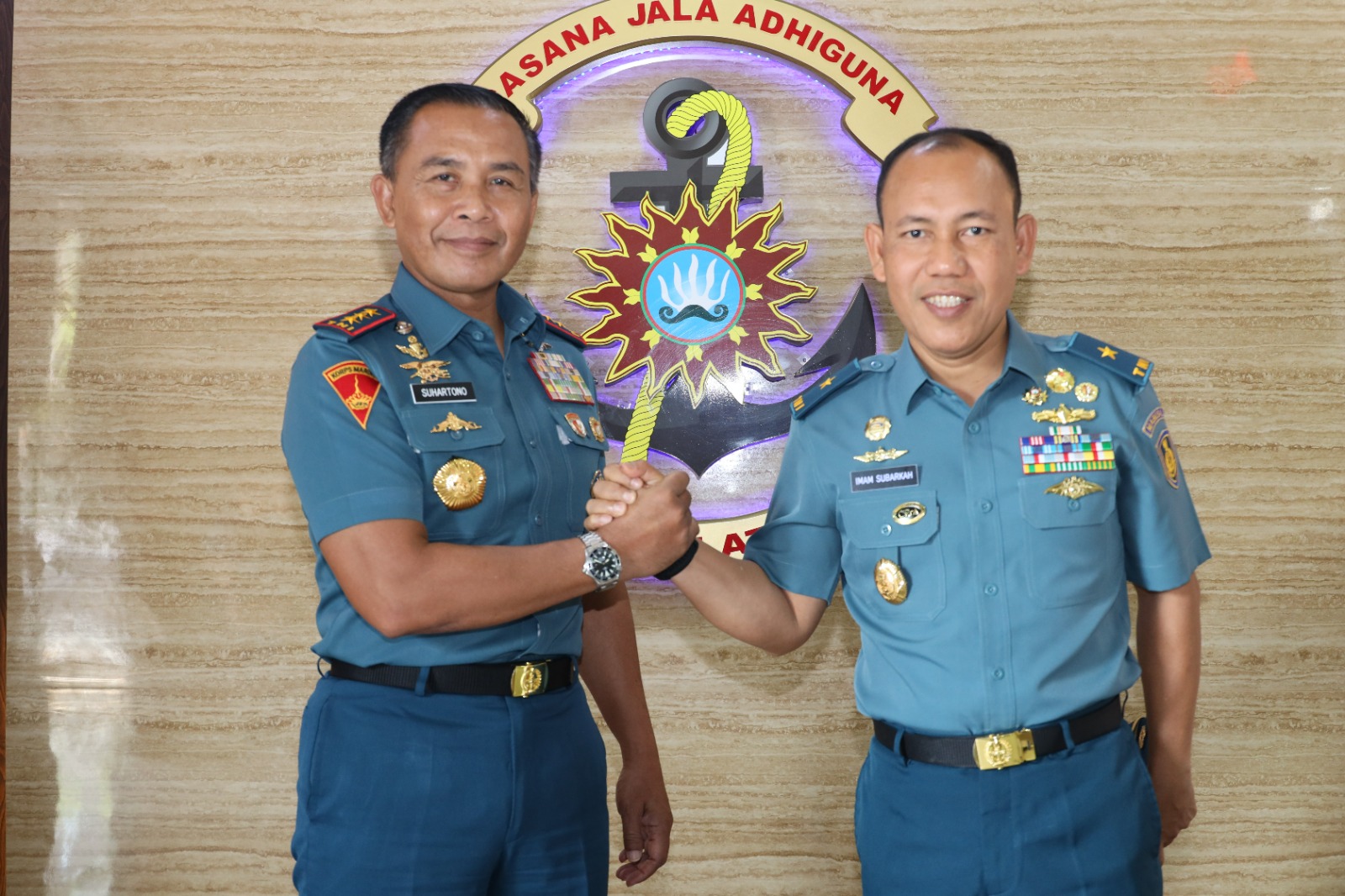 Menjelang Rekonsiliasi Internal Penyelesaian Tutup Periode Bulan Juni 2023 antara Badan Perencanaan (Baren), Badan Logistik (Balog) dan Badan Keuangan (Baku) Semester I TA 2023 Unit Organisasi TNI Angkatan Laut (UO TNI AL), Komandan Komando Pembinaan Doktrin, Pendidikan dan Latihan TNI AL (Dankodiklatal) Letjen TNI Marinir Suhartono menerima kunjungan Kepala Dinas Keuangan TNI Angkatan Laut (Kadiskual) Laksma TNI Imam Subarkah di Lobi Mako Kodiklatal, Bumimoro Surabaya. Kamis, (06/07/2023).