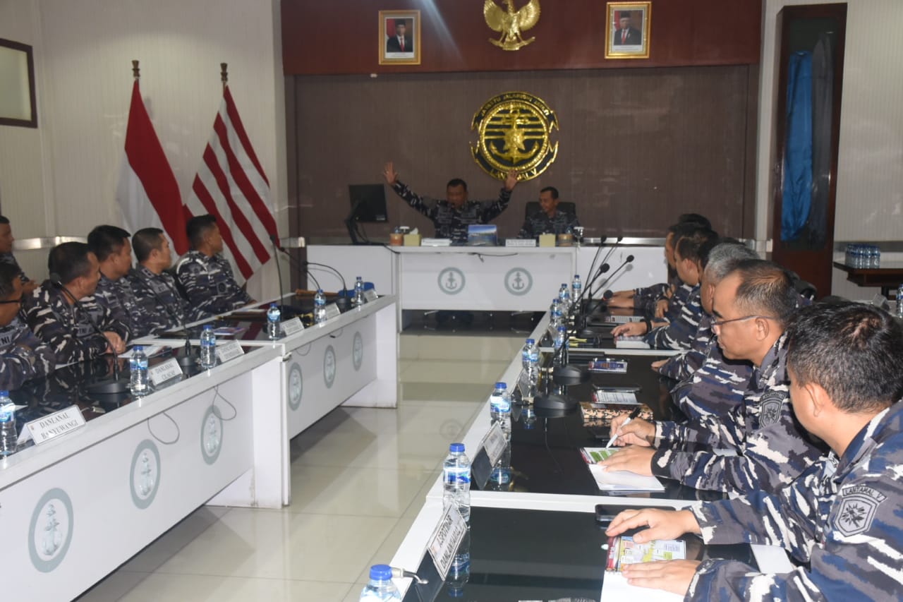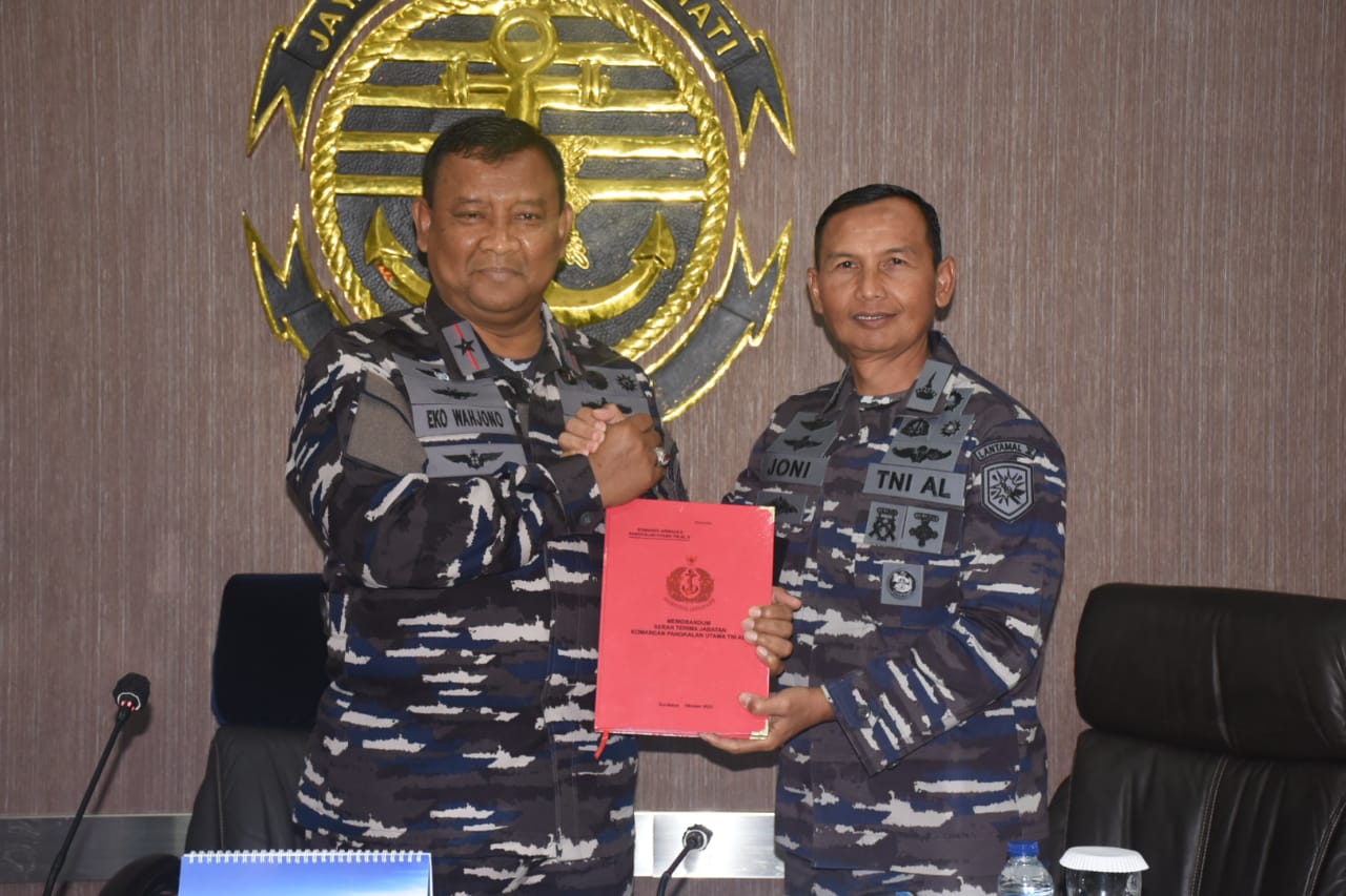 Menjelang serah terima jabatan Komandan Pangkalan Utama TNI AL (Danlantamal) V dilaksanakan pembacaan memorandum serah terima jabatan Danlantamal V dari LaksmaTNI Eko Wahjono, S.E., M.M kepada Kolonel Marinir Joni Sulistiawan, S.H., M.Han., di ruang rapat Mako Lantamal V, Perak, Surabaya (21/10/23).