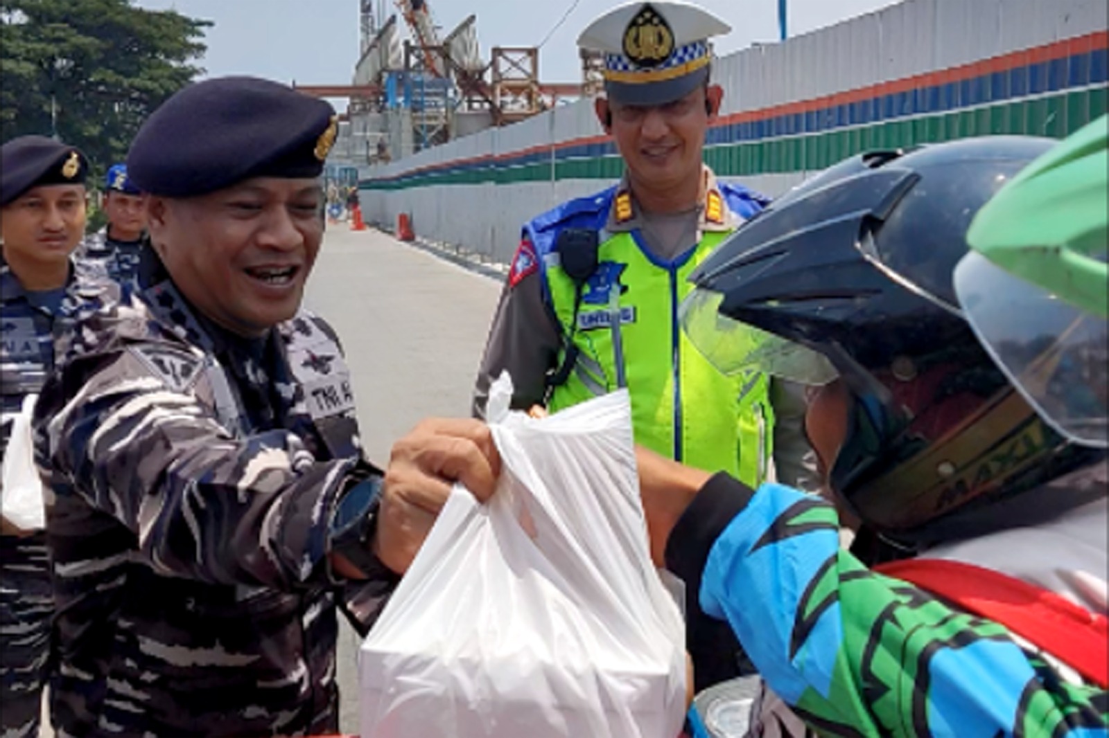 Komandan Pangkalan TNI Angkatan Laut (Danlanal) Semarang Kolonel Laut (E) Joko Andriyanto, S.T., M.Tr. Hanla., M.A.P., mengajak prajurit dan PNS Lanal Semarang bagi bagi nasi box berjumlah 400 box kepada pengguna jalan baik pengemudi angkutan barang maupun driver online di sepanjang jalan R.E Martadinata tepatnya depan Mako Lanal Semarang. Kamis (19/10/2023).