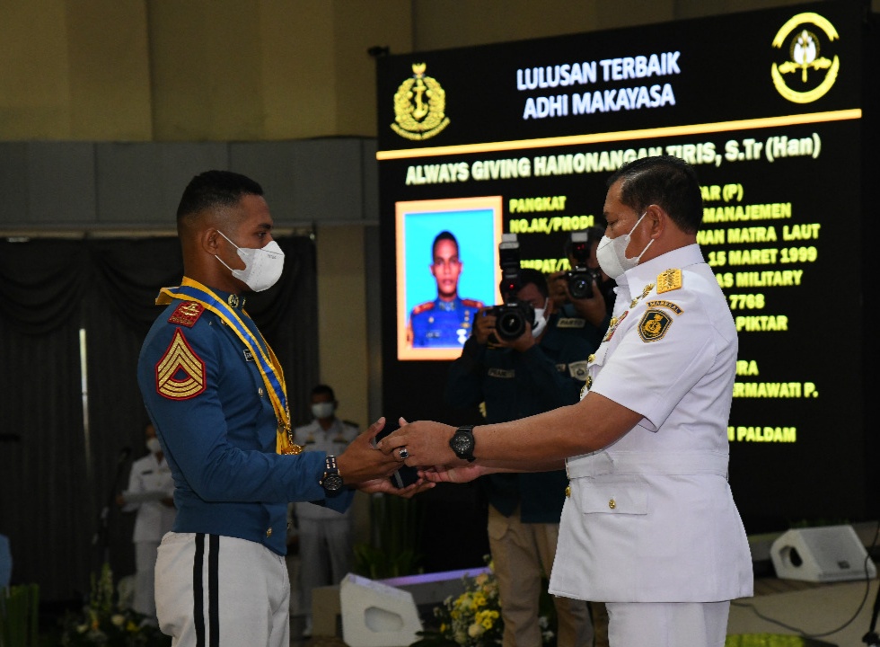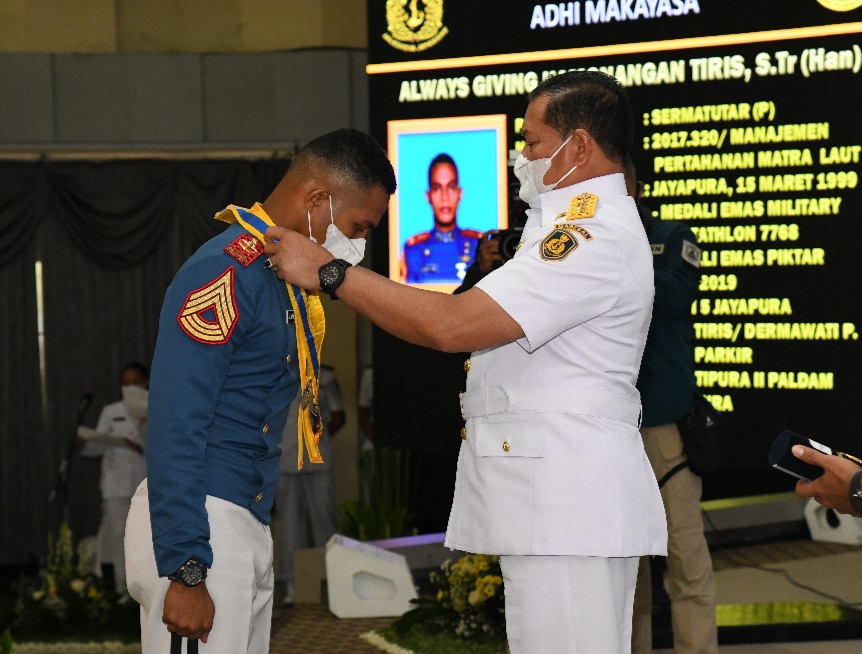 Kepala Staf Angkatan Laut (Kasal) Laksamana TNI Yudo Margono, S.E., M.M., pada upacara penutupan pendidikan (Tupdik) dan Wisuda Sarjana Akademi Angkatan Laut (AAL) Angkatan ke-66 bertempat di Gedung Maspardi, Kesatrian AAL, Bumimoro, Surabaya, Rabu (23/06), menganugerahkan gelar Adhi Makayasa kepada Putra Papua anak juru parkir di Jayapura.