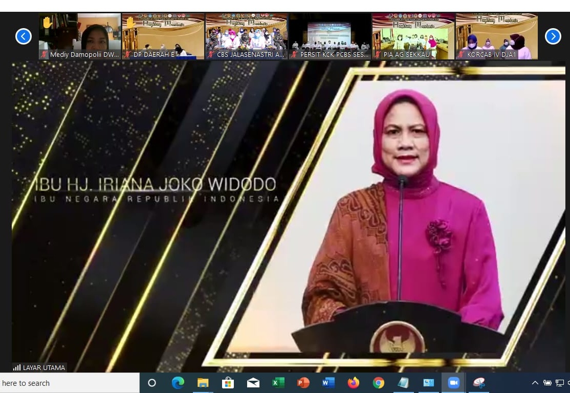 Ketua Cabang Beridiri Sendiri (CBS) Jalasenastri Akademi Angkatan Laut (AAL) Ny. Ayu Nur Alamsyah didampingi Wakil Ketua CBS Jalasenastri AAL Ny. Hesti Rudhi Aviantara beserta pengurus lainnya mengikuti acara Angklung Mendunia secara virtual, di Gedung Tjut Nyak Dien, Kesatrian AAL, Bumimoro, Surabaya, Senin (8/11).