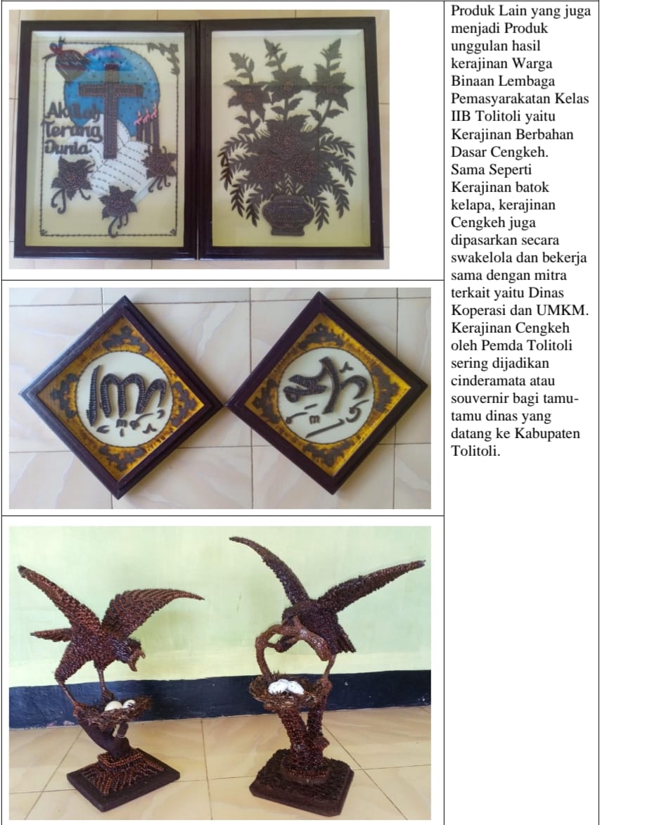 Untuk kerajinan tangan berbahan dasar batok kelapa, kata Makmur–yang baru hampir setahun menjabat sebagai Kalapas Kelas IiB Tolitoli –produknya berupa papan catur, tempat tissue, asbak, nampan, dll.