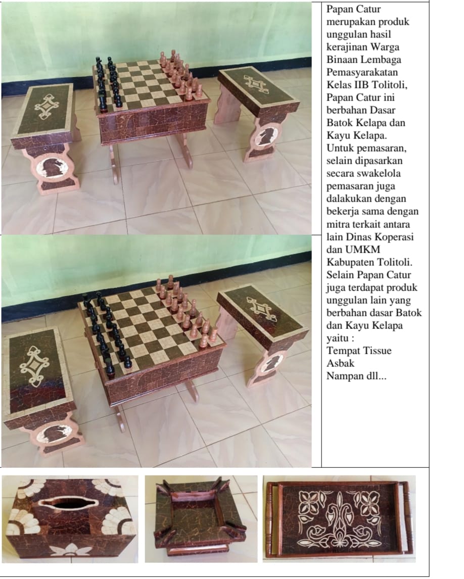 “Papan catur merupakan salah satu produk unggulan dari kerajinaan warga binaan, dan pemasarannya selama ini dilakukan secara swakelola dan Juga bekerjasama dengan Dinas Koperasi dan UMKN Tolitoli, ” kata Makmur, yang sebelumnya pernah menjabat sebagai Kepala Rupbasan Kelas II Tanjung Pinang.