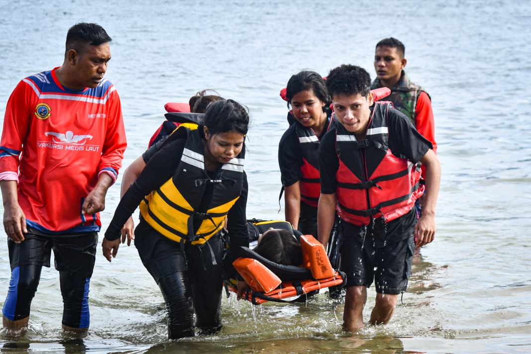 Mahasiswa tampak antusias mengikuti setiap tahapan kegiatan, mulai dari simulasi penggunaan alat keselamatan, teknik pemindahan korban dari perahu ke tandu evakuasi, hingga penanganan awal pasien dengan kondisi trauma maupun gangguan pernapasan di atas kapal.