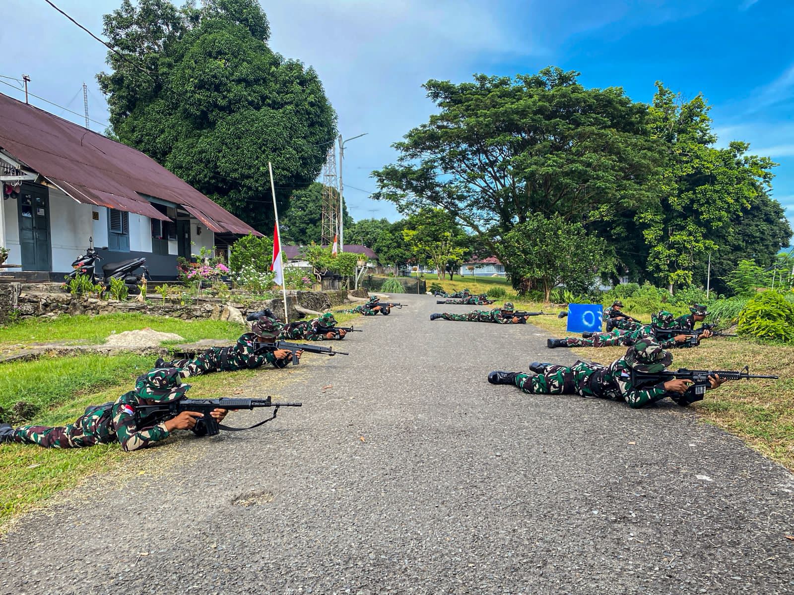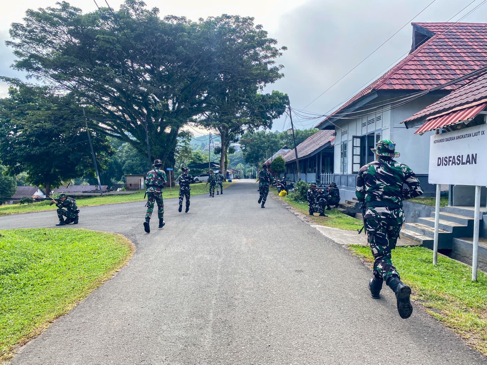 Usai Apel Pagi, prajurit Kodaeral IX melaksanakan senam senjata yang dilanjutkan dengan simulasi patroli perimeter, materi ditekankan pada deteksi jalan pendekat serta orientasi pengamanan strategi jalur-jalur di wilayah Mako untuk memperkuat sistem keamanan internal pangkalan.