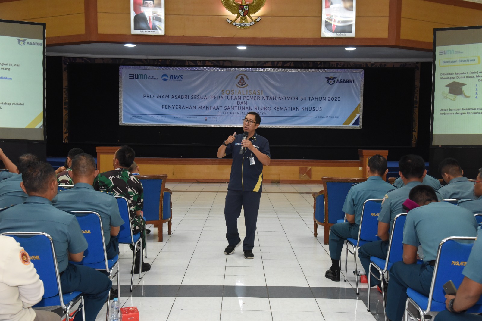 Dianggap sebagai bagian dari kesejahteraan Prajurit , Komando Pembinaan Doktrin Pendidikan dan Latihan TNI Angkatan Laut (Kodiklatal) mengadakan Sosialisasi Program dari PT ASABRI (Persero) sesuai Peraturan Pemerintah Nomor 54 tahun 2020, yang dilaksanakan di Gedung R. Moeljadi Mako Kodiklatal Bumimoro Surabaya, Rabu (24/5/2023).
