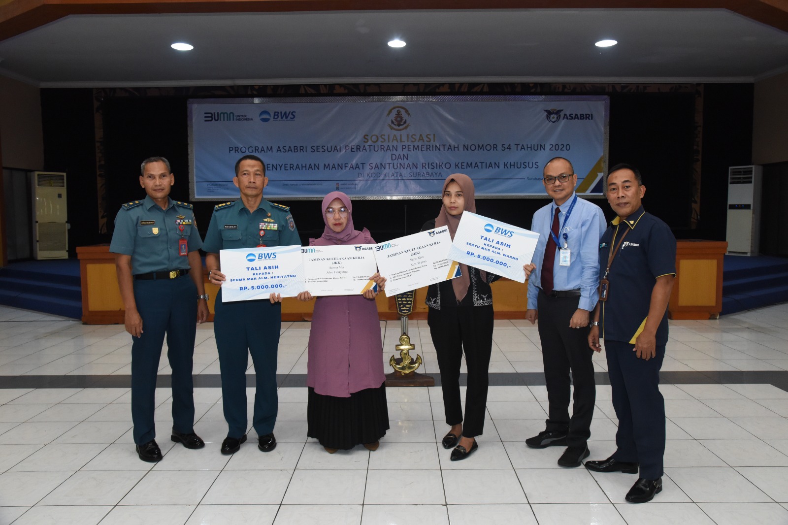 Selain sosialisasi dari PT.ASABRI (Persero) dan BWS , juga dilaksanakan penyerahan santunan penyerahan manfaat santunan resiko kematian khusus kepada Ibu Indartik ahli waris dari Almarhum Sertu Mus Warno anggota Satsik Denmako Kodiklatal, dan Ibu Siti Mudawamah ahli waris dari Almarhum Serma Marinir Heriyanto anggota Satma Denmako Kodiklatal.