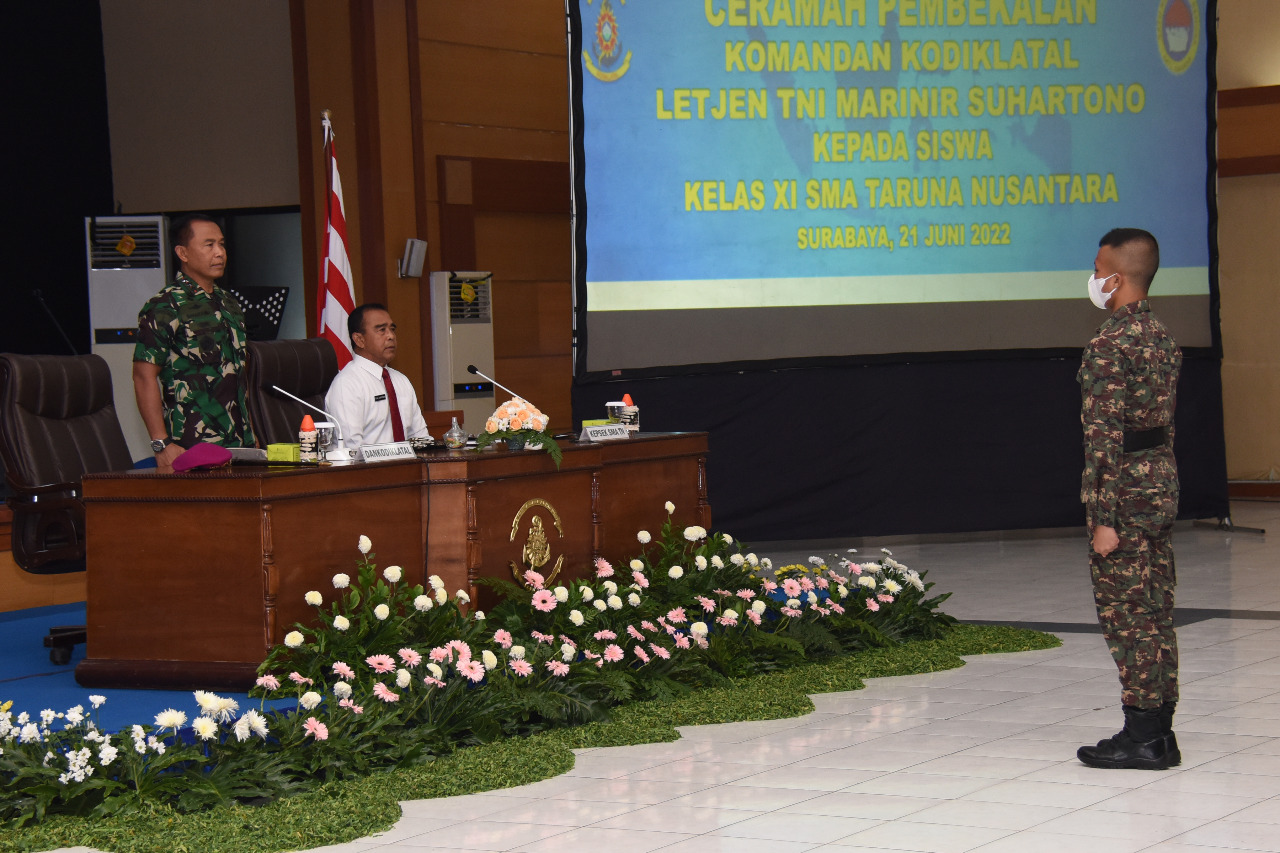 Setelah disambut penampilan Brassband Siswa Kodiklatal, dan menyaksikan profil Kodiklatal seluruh siswa kelas XII SMA Taruna Nusantara mendapat ceramah pembekalan dari Dankodiklatal. Adapun dalam kesempatan tersebut Dankodiklatal menyampaikan secara umum tentang TNI AL dan kemaritiman, diantaranyatujuh (7) pilar Kebijakan Kelautan Indonesia, tugas pokok TNI AL melaksanakan pertahanan di laut, menegakkan hukum dan menjaga keamanan wilayah laut yurisdiksi nasional, juga melakasanakan tugas diplomasi TNI AL dalam rangka mendukung kebijakan politik luar negeri Indonesia, melaksanakan tugas TNI untuk pembangunan dan pengembangan matra laut, serta melaksanakan pemberdayaan wilayah pertahanan laut.