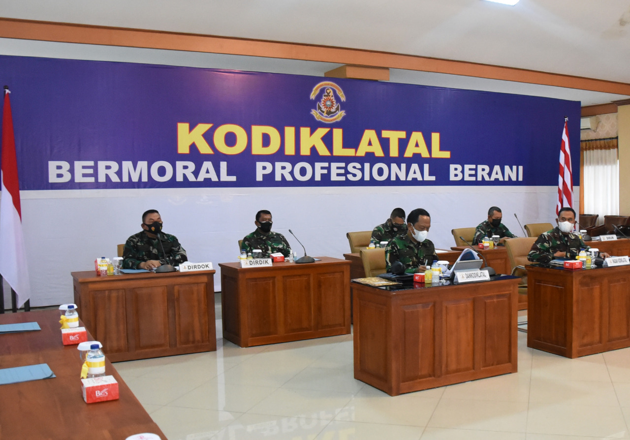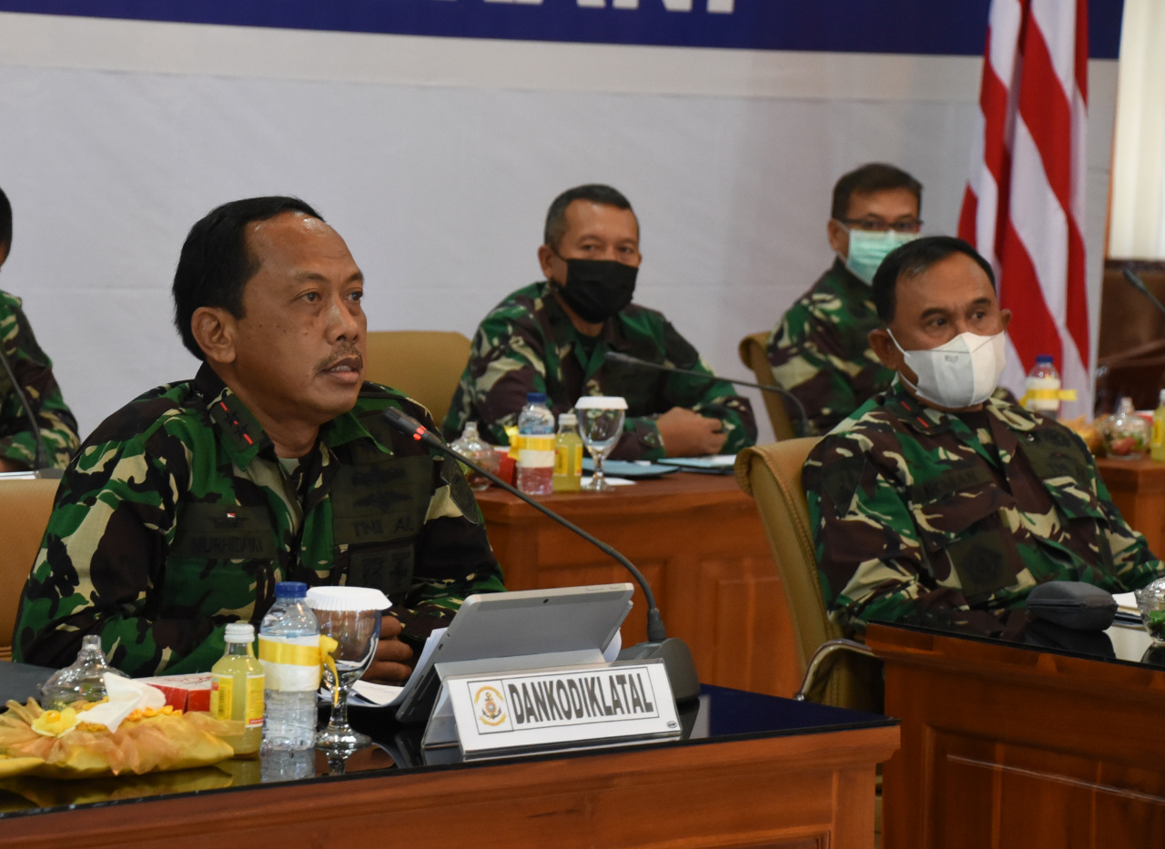 Komandan Komando Pembinaan Doktrin Pendidikan dan Latihan TNI Angkatan Laut (Dankodiklatal) Laksda TNI Nurhidayat bersama pejabat Utama Kodiklatal mengikuti Focus Group Discussion melalui Vidio Conference (Vicon) dengan Kepala Staf Angkatan Laut (Kasal) Laksamana TNI Yudo Margono, S.E., M.M di Ruang Joglo Moeljadi Kesatrian Kodiklatal Bumimoro Surabaya, Senin, (15/3/2021).