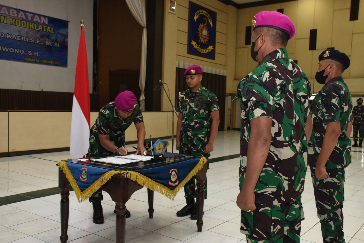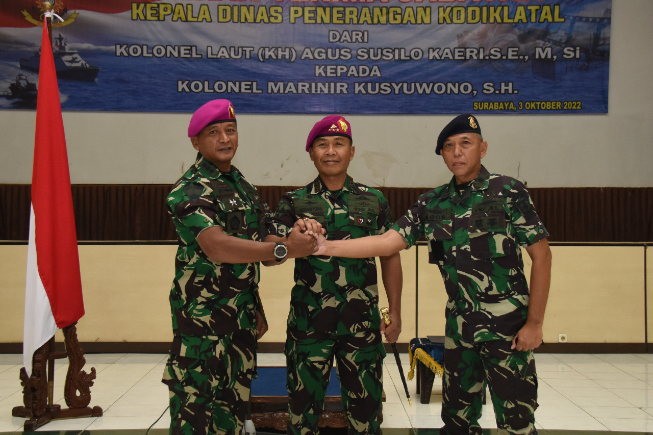 Komandan Komando Pembinaan Doktrin Pendidikan dan Latihan TNI Angkatan Laut (Dankodiklatal) Letnan Jenderal TNI Marinir Suhartono, memimpin acara serah terima jabatan Kepala Dinas Penerangan atau Kadispen Kodiklatal, bertempat di Gedung R.E. Martadinata Kesatrian Kodiklatal Bumimoro, Surabaya pada Senin (3/10).