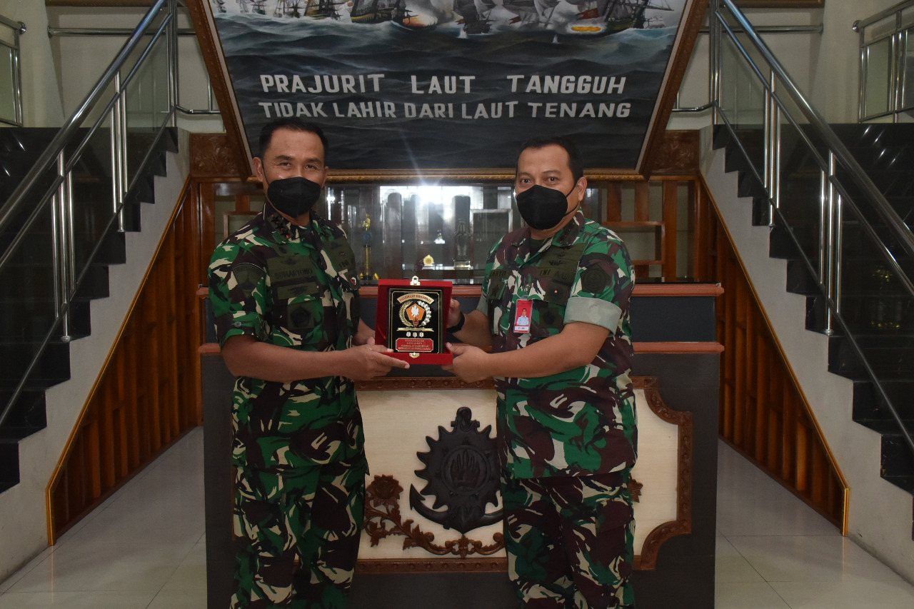 Komandan Komando Pembinaan Doktin Pendidikan dan Latihan TNI Angkatan Laut (Dankodiklatal) Letnan Jenderal TNI Marinir Suhartono menerima Kunjungan Kehormatan Komandan Pusat Pendidikan dan Latihan Pertahanan Udara Nasional (Danpusdiklat Hanudnas) Kolonel Pnb Safeano Cahyo Wibowo, S.T., di Loby Makao Kodiklatal, Bumimoro, (10/3/2022).