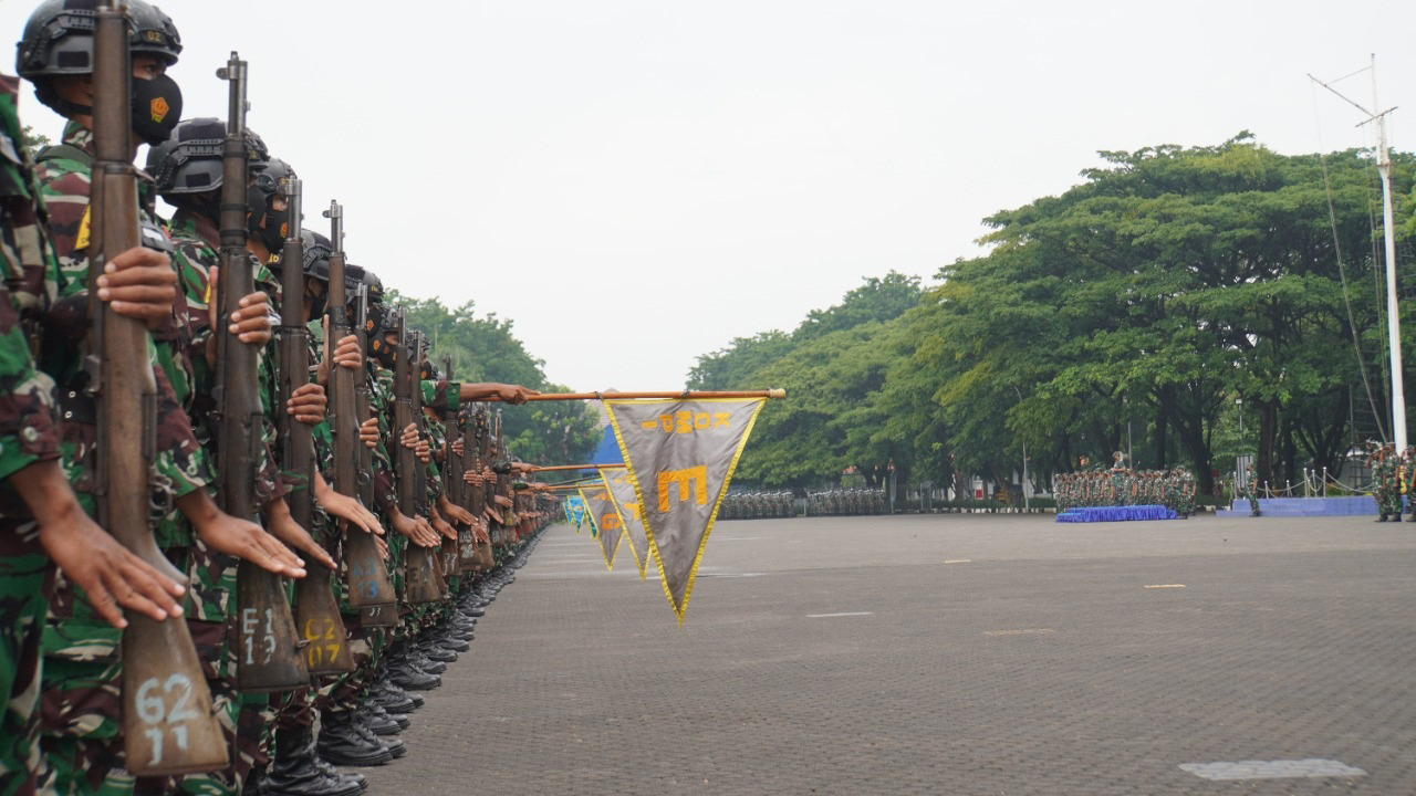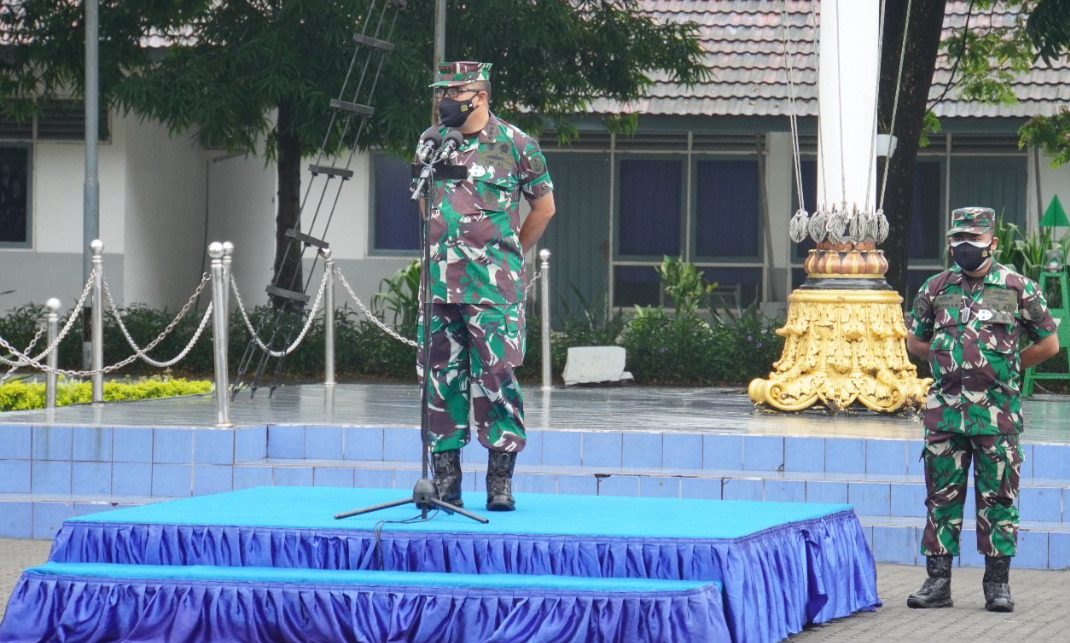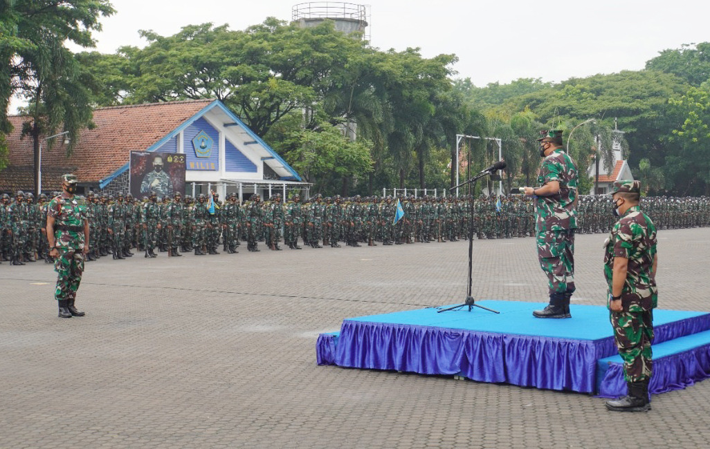 Komandan Pusat Pendidikan dan Latihan Dasar Militer (Danpuslatdiksarmil) Kolonel Laut (P) Johanes Djanarko Wibowo memimpin apel Gabungan Antap dan siswa di lapangan Apel Kawah Candradimuka, Puslatdiksarmil, Juanda, Sidoarjo, Senin (20/12).