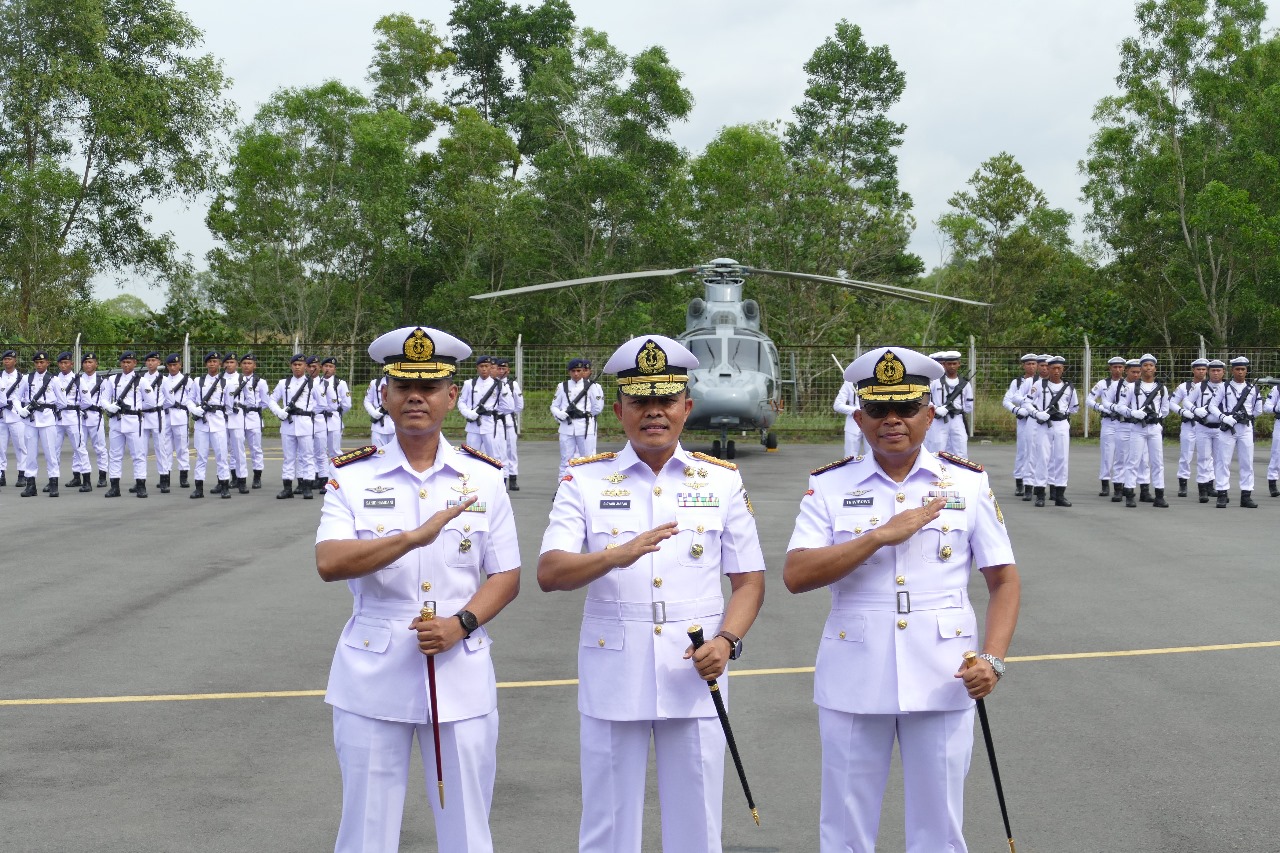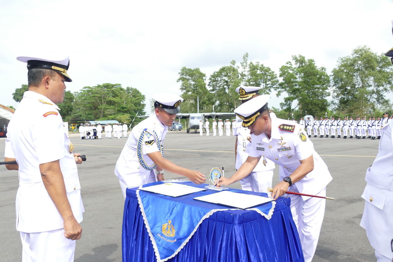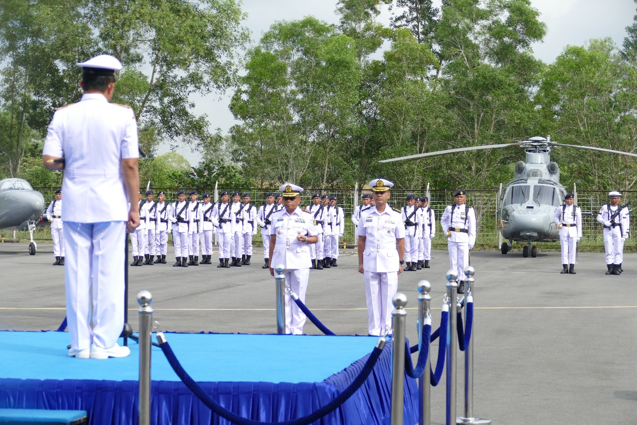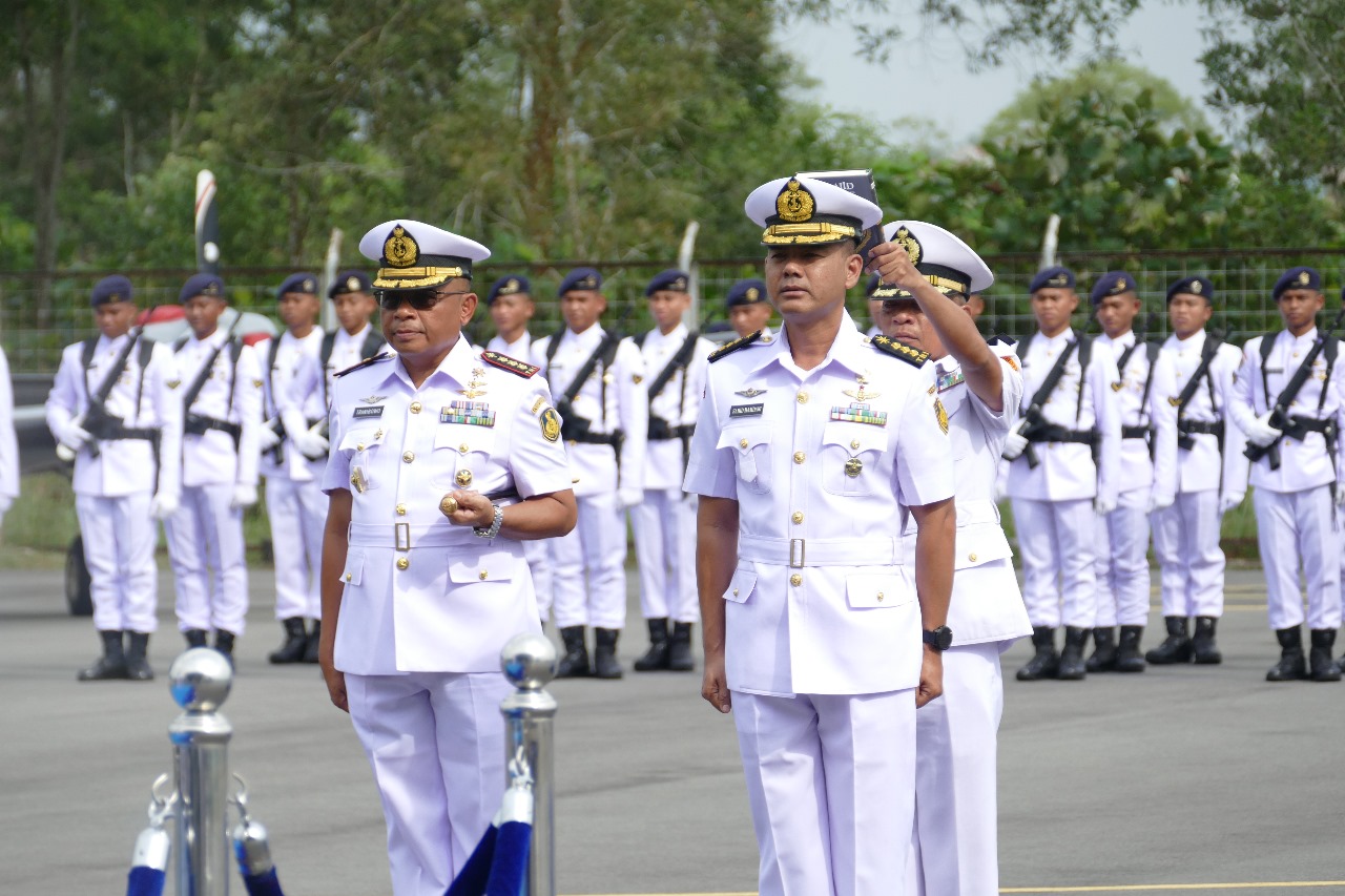 Komandan Pusat Penerbangan TNI Angkatan Laut (Danpuspenerbal), Laksamana Muda TNI Sisyani Jaffar memimpin jalannya Upacara Serah Terima Jabatan (Sertijab) Komandan Pangkalan Udara TNI AL (Lanudal) Tanjungpinang di Apron Hanggar Lanudal Tanjungpinang, Kepulauan Riau, Kamis (29/8/2024).