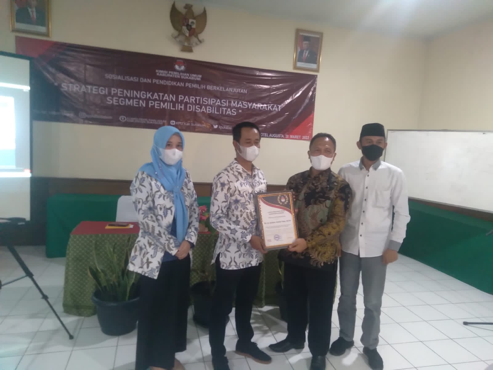 Komisi pemilihan umum (KPU) Kabupaten Sukabumi mengadakan sosialisasi pendidikan pemilih berkelanjutan dengan tema Strategi Peningkatan Partisipasi Masyarakat Segmen Pemilih Disabilitas, bertempat Di Hotel Agusta Jl. Cikulu No. 72, Cisaat, Cisande, Kec. Cicantayan, Kabupaten Sukabumi, Jawa Barat, Senin 28/3/2022