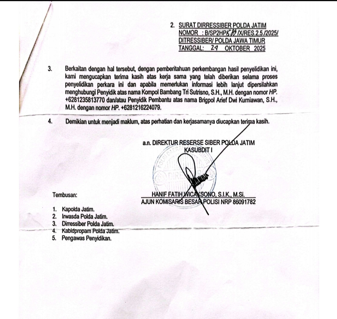 Hingga berita ini ditulis, belum ada keterangan resmi terbaru dari pihak Ditressiber Polda Jawa Timur terkait perkembangan substansi perkara tersebut.