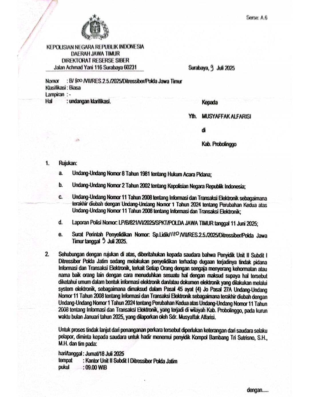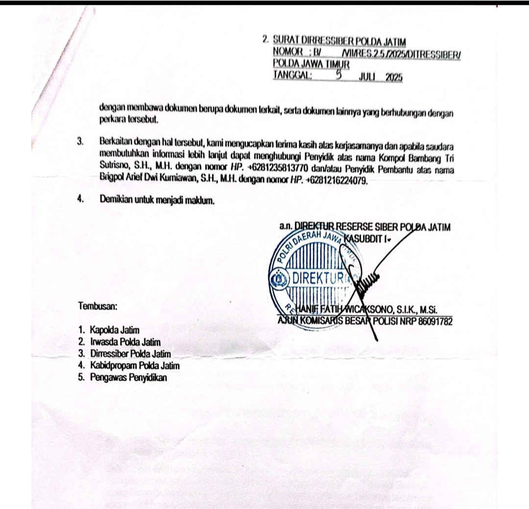 Hingga berita ini ditulis, belum ada keterangan resmi terbaru dari pihak Ditressiber Polda Jawa Timur terkait perkembangan substansi perkara tersebut.