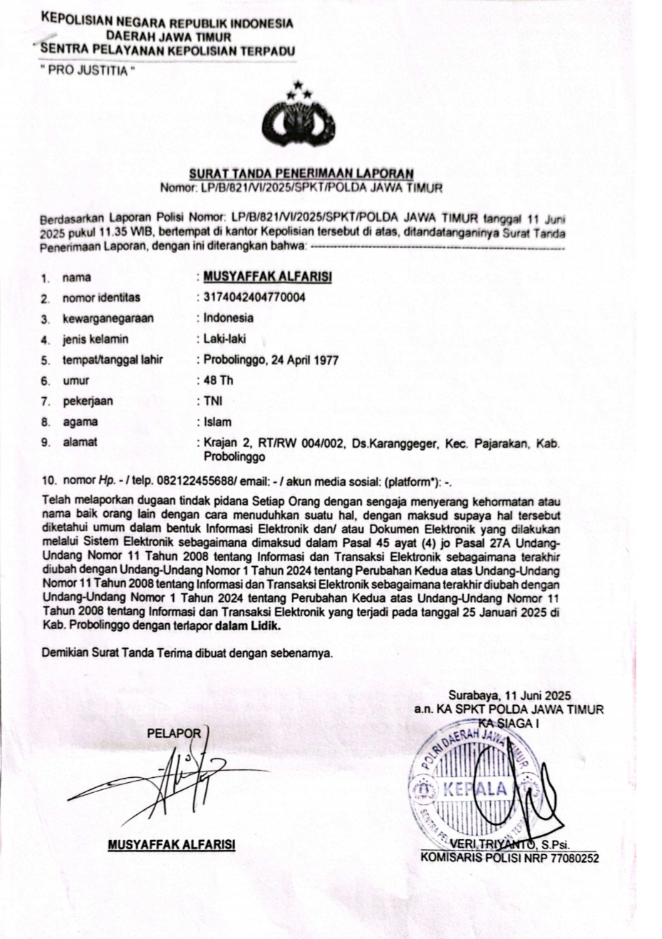 Kasus tersebut bermula dari laporan polisi Nomor LP/B/821/VI/2025/SPKT/Polda Jawa Timur tertanggal 11 Juni 2025 terkait dugaan pelanggaran Pasal 45 ayat (4) juncto Pasal 27A Undang-Undang Informasi dan Transaksi Elektronik (ITE) sebagaimana telah diperbarui melalui Undang-Undang Nomor 1 Tahun 2024.