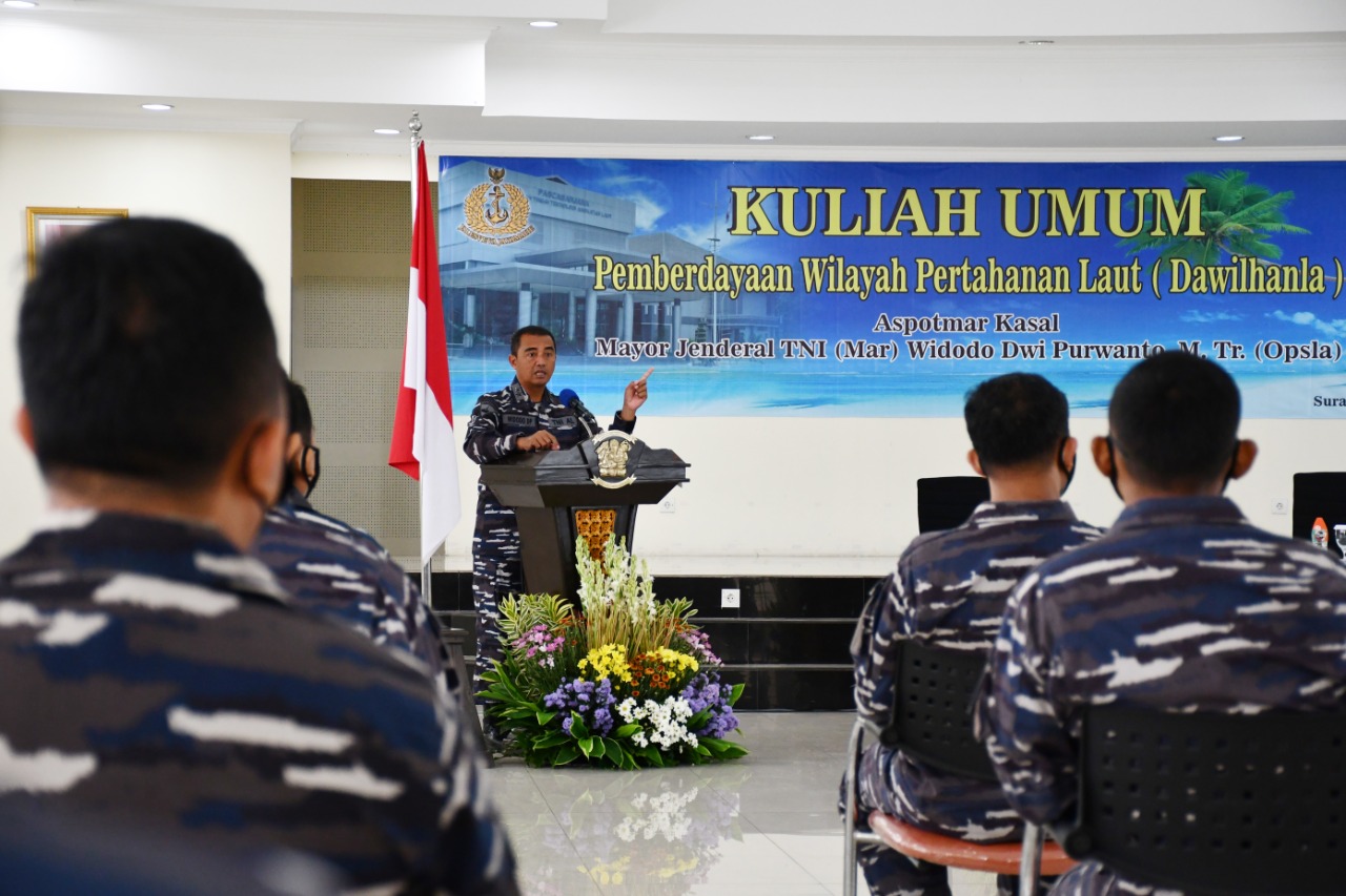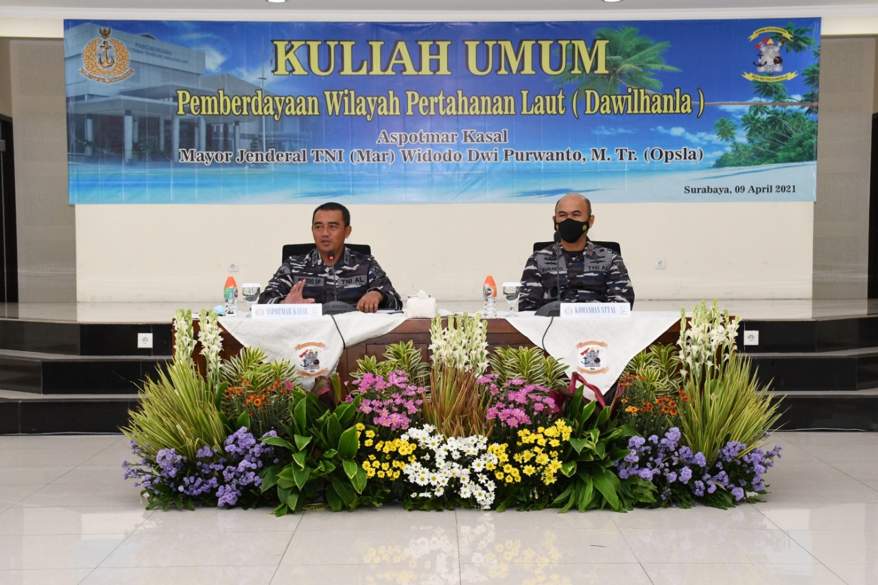 Lembaga Pendidikan Sekolah Tinggi Teknologi Angkatan Laut (STTAL) menyelenggarakan Kuliah Umum yang disampaikan oleh Asisten Potensi Maritim Kasal, Mayor Jenderal TNI Marinir Widodo Dwi Purwanto tentang “Pemberdayaan Wilayah Pertahanan Laut (Dawilhanla)” yang dilaksanakan secara Offline sebanyak 30 personel dan secara online sebanyak 216 personel terdiri Perwira staf, dosen tetap serta para mahasiswa Prodi S2, S1 dan D3 STTAL, bertempat di Auditorium Pulau Nipa Kampus STTAL Jl. Bumimoro Surabaya. Jumat (9/4/2021).