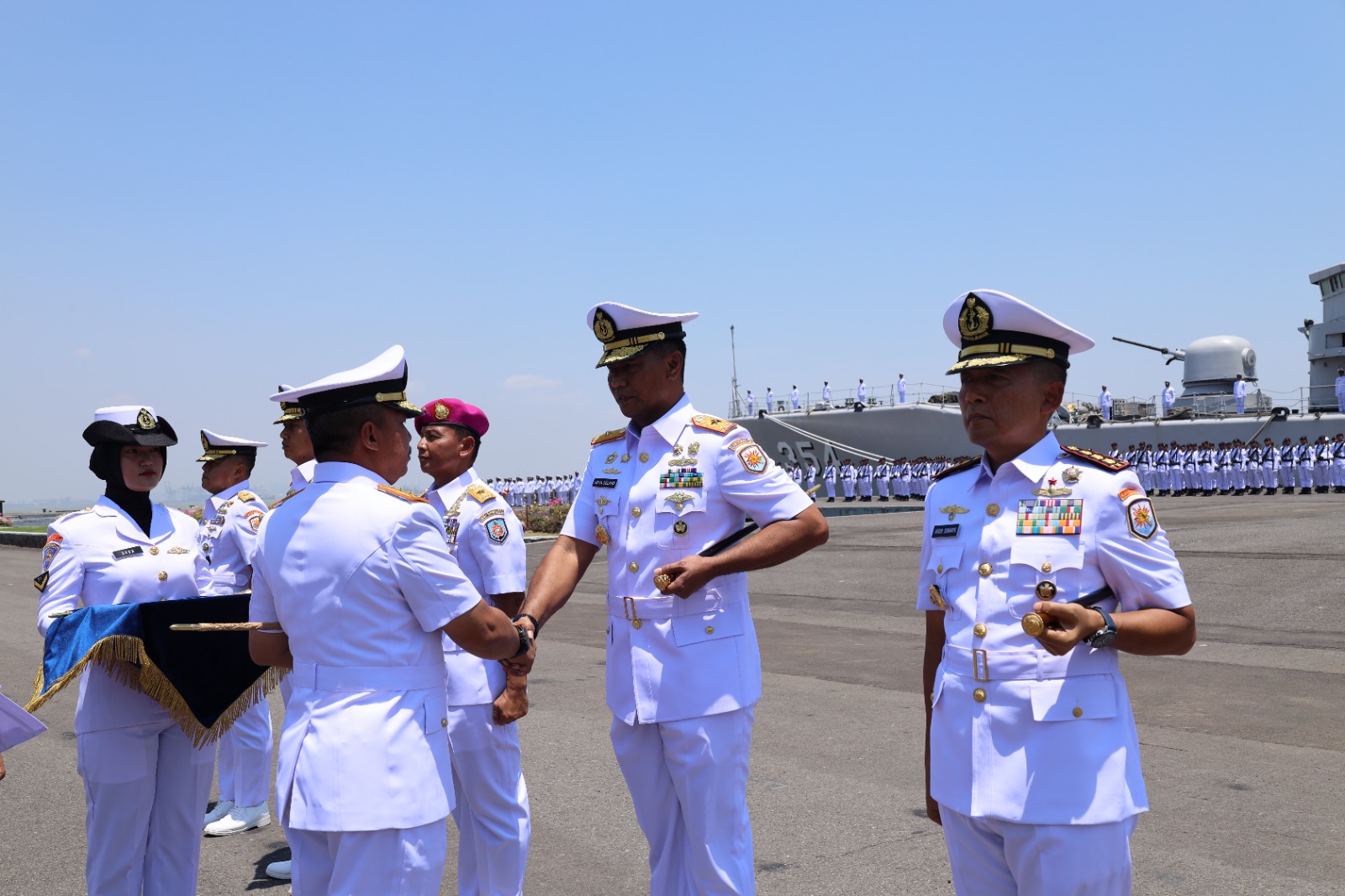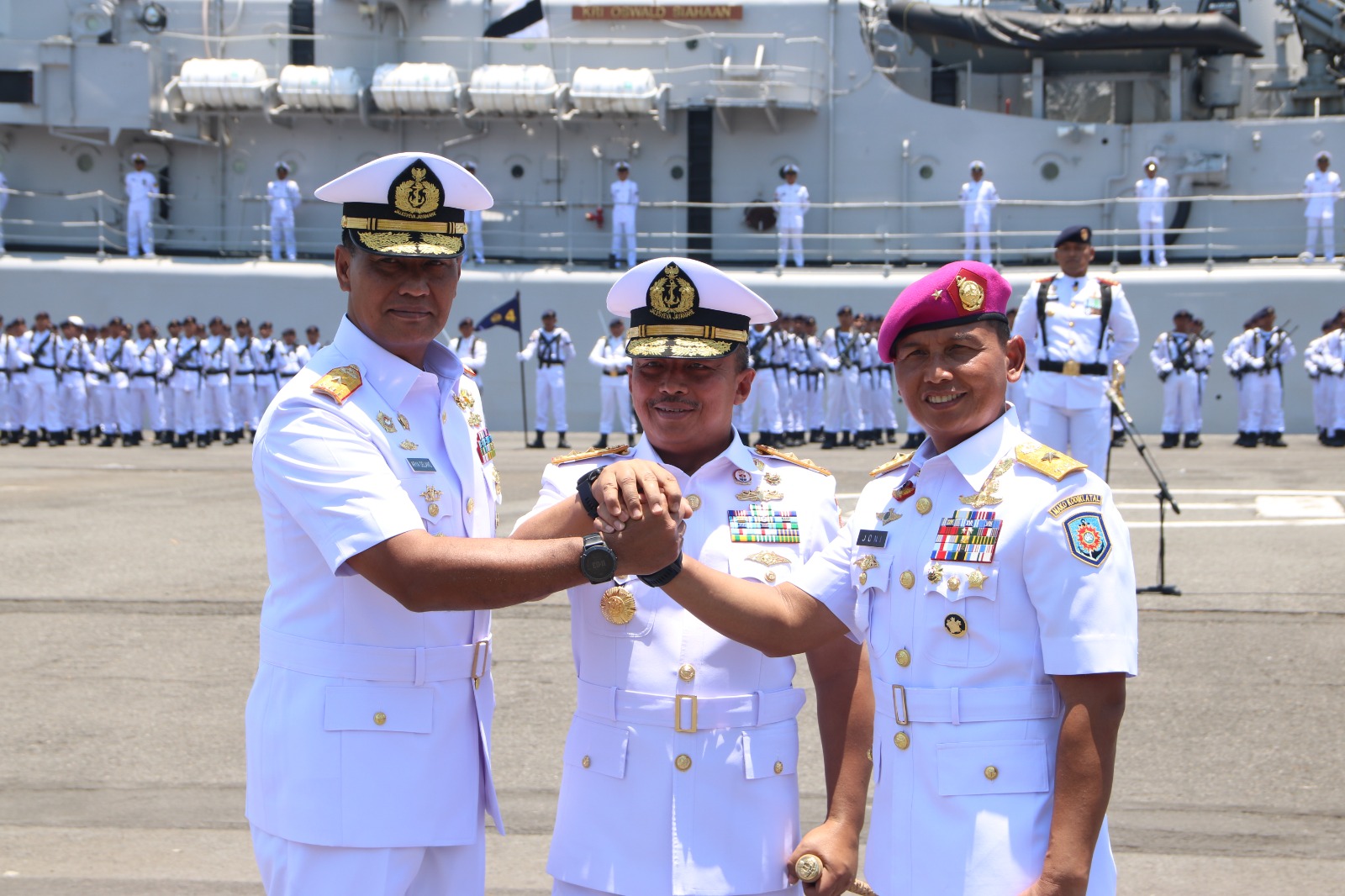 Upacara Serah Terima Jabatan (Sertijab) Komandan Lantamal V resmi diserahterimakan dari Brigjen TNI (Mar) Joni Sulistiawan, S.H., M.Han., kepada Laksma TNI Dr. Arya Delano, S.E., M.Pd., M.Han., yang dipimpin langsung oleh Pangkoarmada II Laksda TNI Ariantyo Condrowibowo, bertempat di Dermaga Madura Ujung, Koarmada II, Surabaya. Senin (07/10/2024).