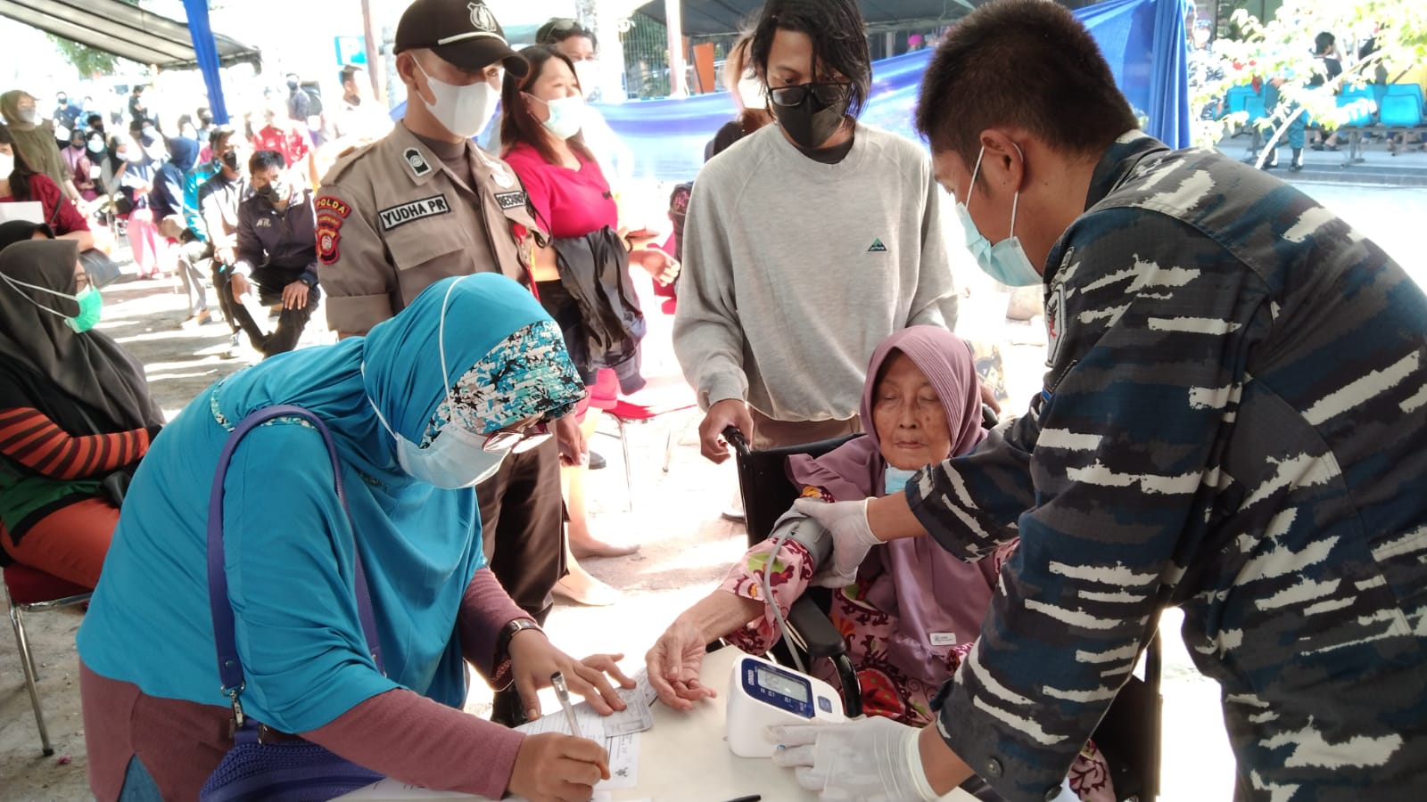 Bahkan dengan semangat yang luar biasa, salah satu masyarakat datang dengan menggunakan Kursi Roda yang diantar oleh keluarganya untuk mengikuti vaksinasi Covid-19.