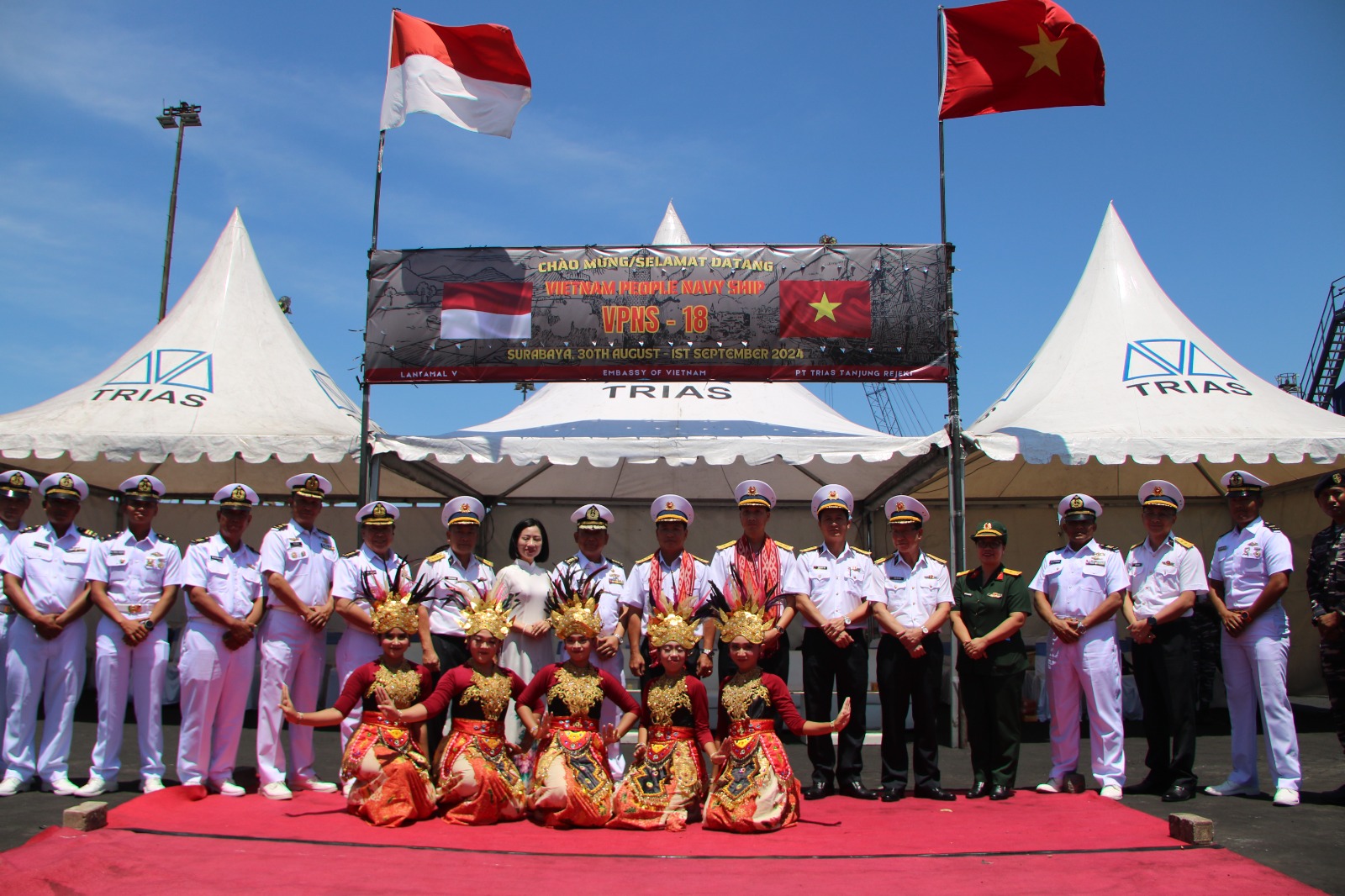 Hadir dalam kegiatan penyambutan Kapal perang Vietnam VPNS 18 antara lain Asops Danlantamal V Kolonel Laut (P) Muhammad Taufik, M.Tr. Hanla., M.M., Kadiskes Lantamal V Kolonel Laut (K) dr. Jemmy Sasongko, Sp.B (K) Onk., Pabandya Ops Sops Lantamal V Mayor Laut (P) Aris.