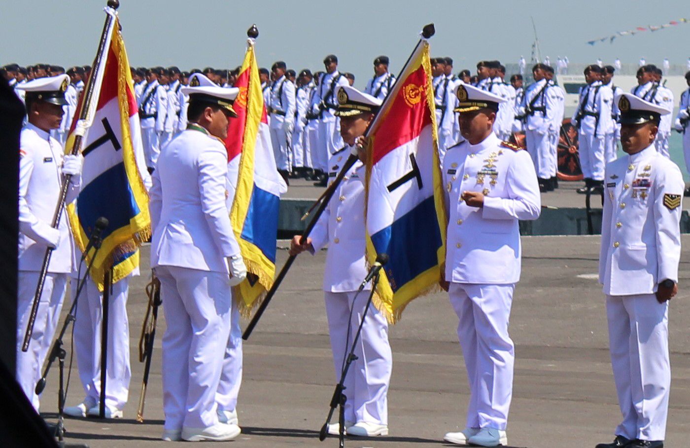Komandan Lanudal Sabang Mayor Laut (P) Nasrulloh menerima langsung piagam penghargaan dan bendera Lanudal Teladan dari Kepala Staf TNI Angkatan Laut (KASAL) Laksamana TNI Dr. Muhammad Ali yang diserahkan pada upacara peringatan HUT ke-78 TNI AL di Dermaga Madura, Koarmada II, Ujung, Surabaya, Senin (11/9/2023).