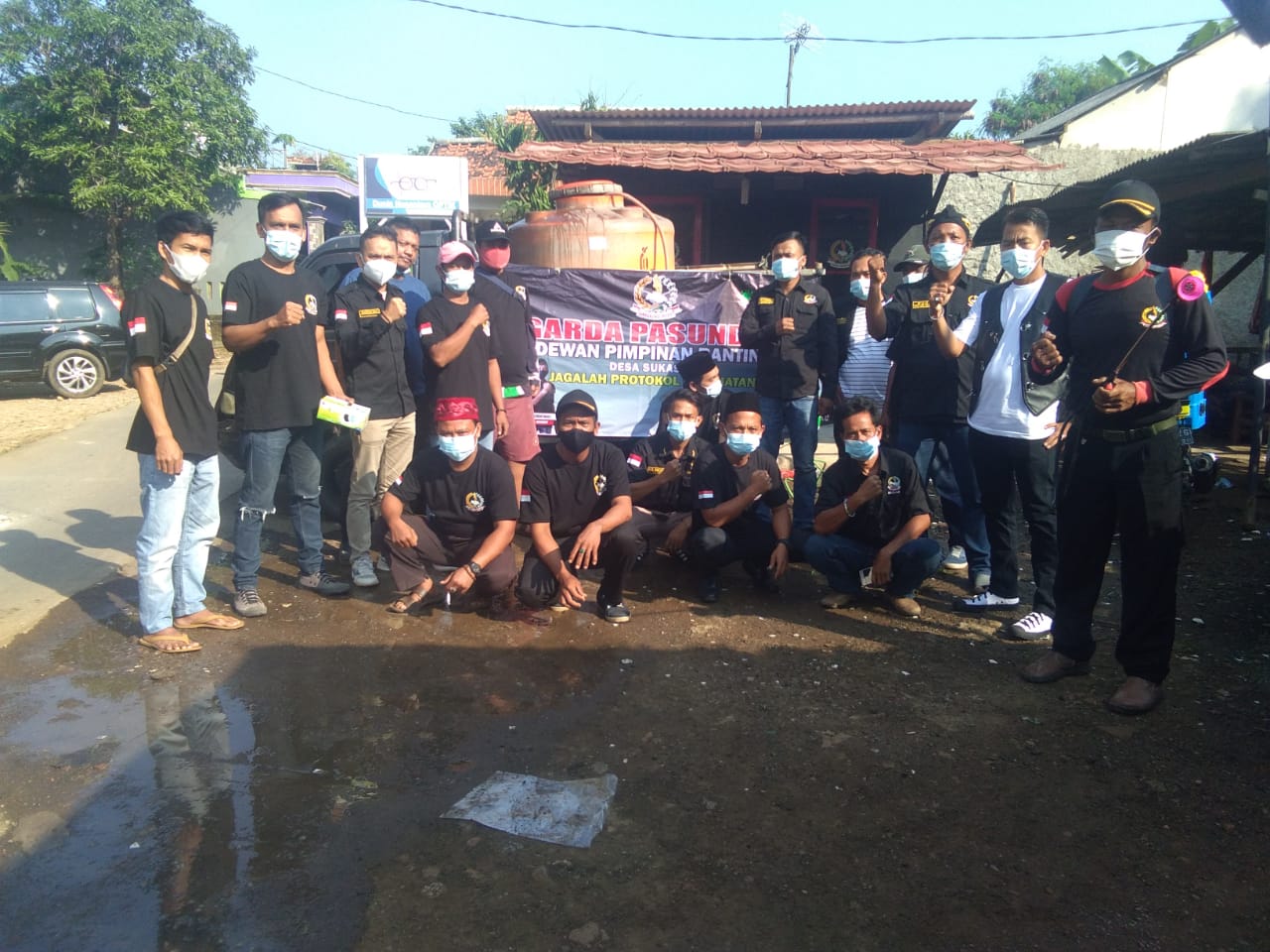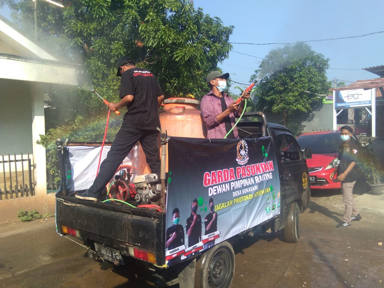Ketua Dewan Perwakilan Daerah (DPD) Garda Pasundan melaksanakan penyemprotan disinfektan di lingkungan Desa Sukasari, Kecamatan Serang Baru, Kabupaten Bekasi, dalam rangka pencegahan Covid-19 yang saat ini kasusnya sudah melonjak.