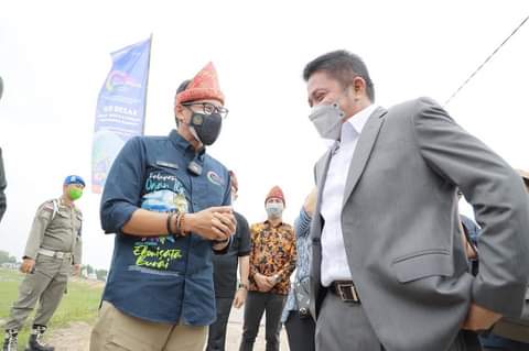Mentri pariwisata dan ekonomi kreatif Sandiaga salahuddin uno Memberikan apresiasi atas Peran Gubernur Sumsel H Herman Deru terhadap perkembangan desa wisata di Sumsel apresiasi tersebut diberikan Menparekraf dalam bentuk piagam sebagai pembina Desa Wisata Ekowisata yang diserahkannya secara langsung disela-sela kunjungan kerjanya di Desa Wisata Ekowisata Burai Kabupaten Ogan Ilir, Kamis (30/9) siang.