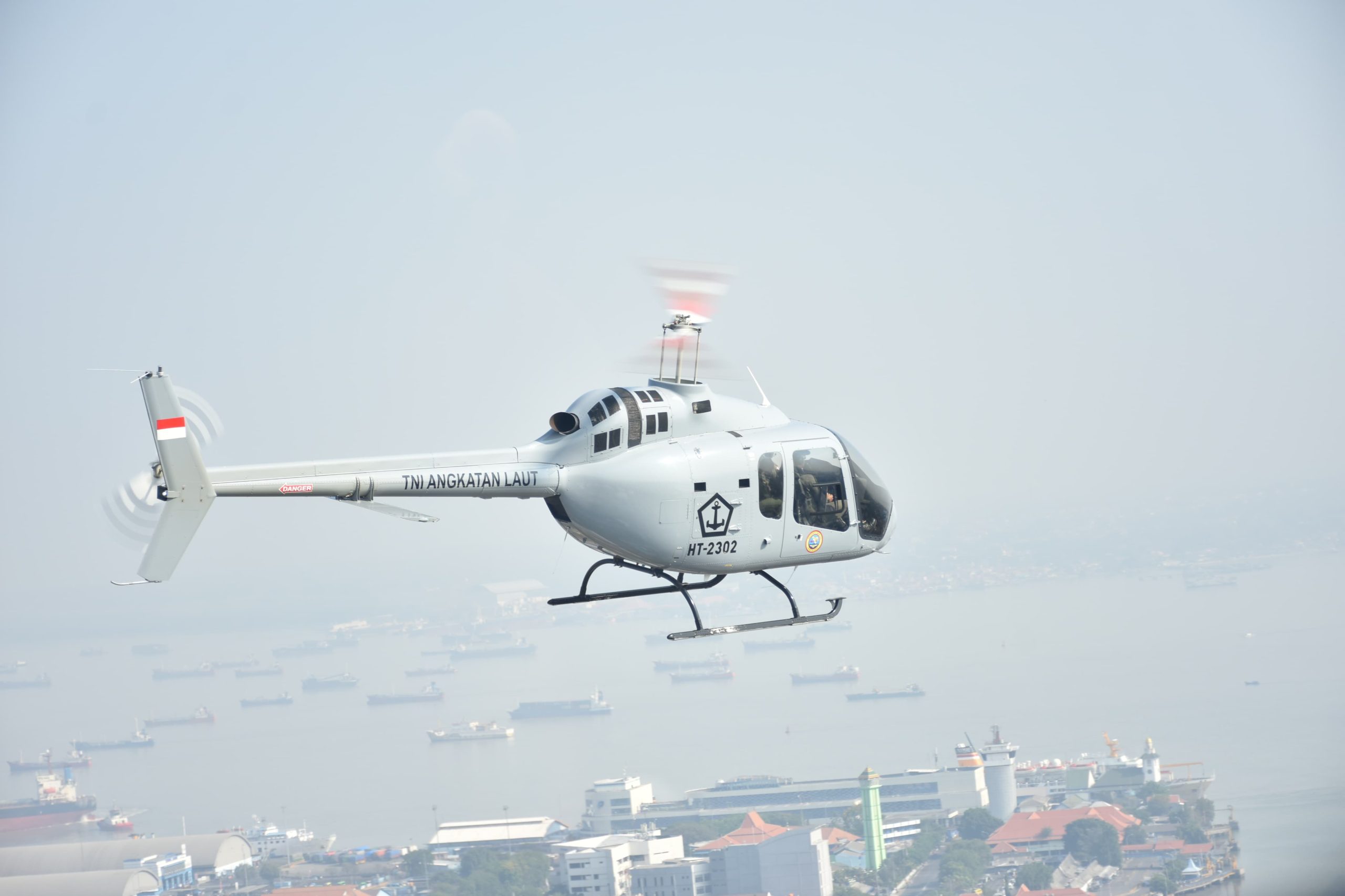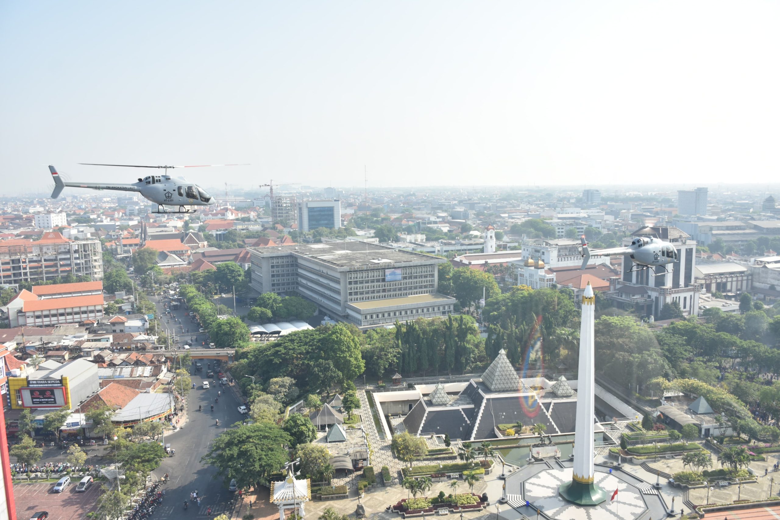 Kemeriahan Hari Jadi Ke-78 TNI AL tidak hanya dirayakan Upacara dan Naval Base Open Day di Koarmada ll saja, tetapi juga digelar Kirab Kota yang melibatkan ribuan peserta dari berbagai satuan unsur TNI AL wilayah Surabaya, salah satunya Pusat Penerbangan TNI Angkatan Laut (Puspenerbal) Ranger Flight helikopter Bell 505 Jet Ranger memberi salam dari langit saat flypas di atas Tugu Pahlawan, Minggu (17/9/2023).