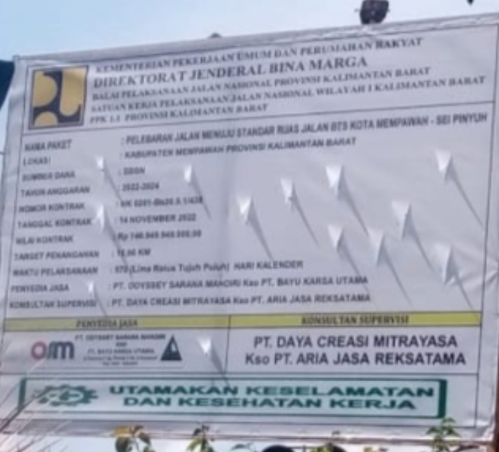 Proyek pekerjaan ini dari Kementerian PUPR dibawah Ditjend Bina Marga, melalui Balai Pelaksana Jalan Nasional (BPJN) Wilayah Kalimantan Barat.