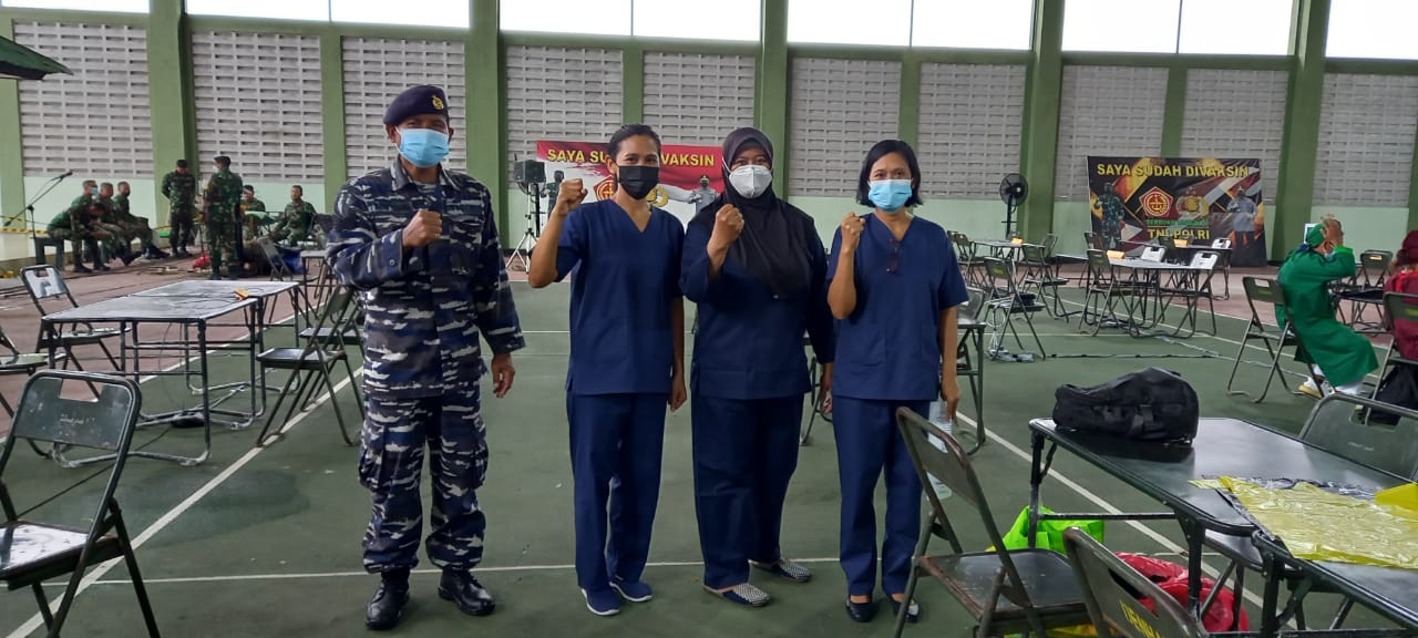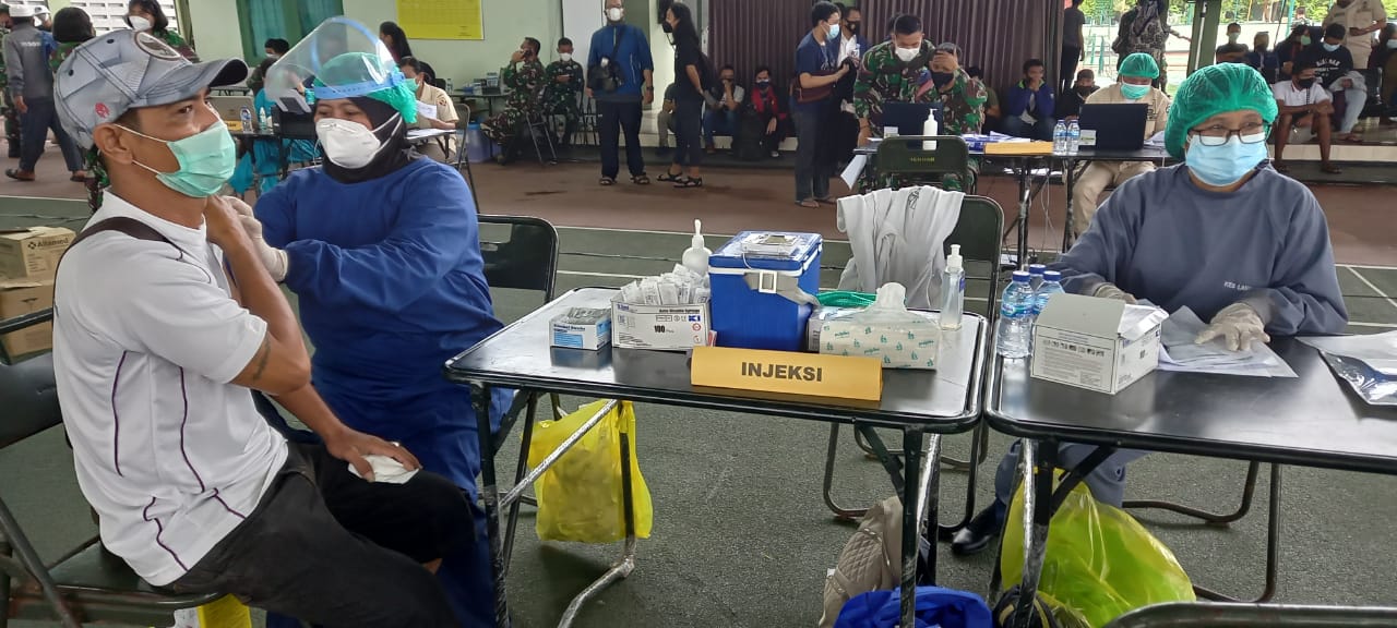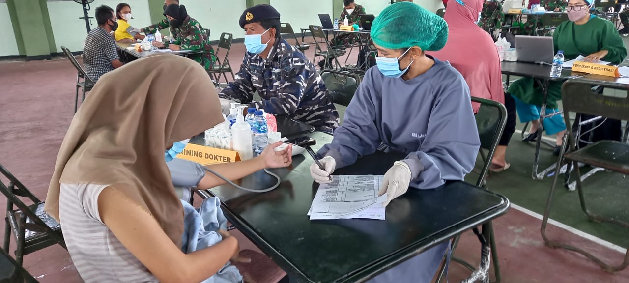 Dalam upaya membantu Pemerintah untuk mempercepat pelaksanaan vaksin bagi masyarakat dan untuk memutus mata rantai penyebaran Virus Covid-19, Tenaga Kesehatan (Nakes) dari Balai Kesehatan (BK) Pangkalan TNI AL (Lanal) Denpasar yang dipimpin oleh Ka BK Lanal Denpasar Kapten Laut (K/W) I Gusti Ayu Meilani, A.Md. Kep., bergabung dengan Nakes dari TNI/Polri Wilayah Kodam IX/Udayana melaksanakan kegiatan Serbuan Vaksin ke 2 bagi remaja usia 12-17 tahun dan masyarakat umum di GOR Praja Raksaka Kodam IX/Udayana Kepaon Kota Denpasar sebagai tenaga vaksinator, Selasa (3/8/2021).