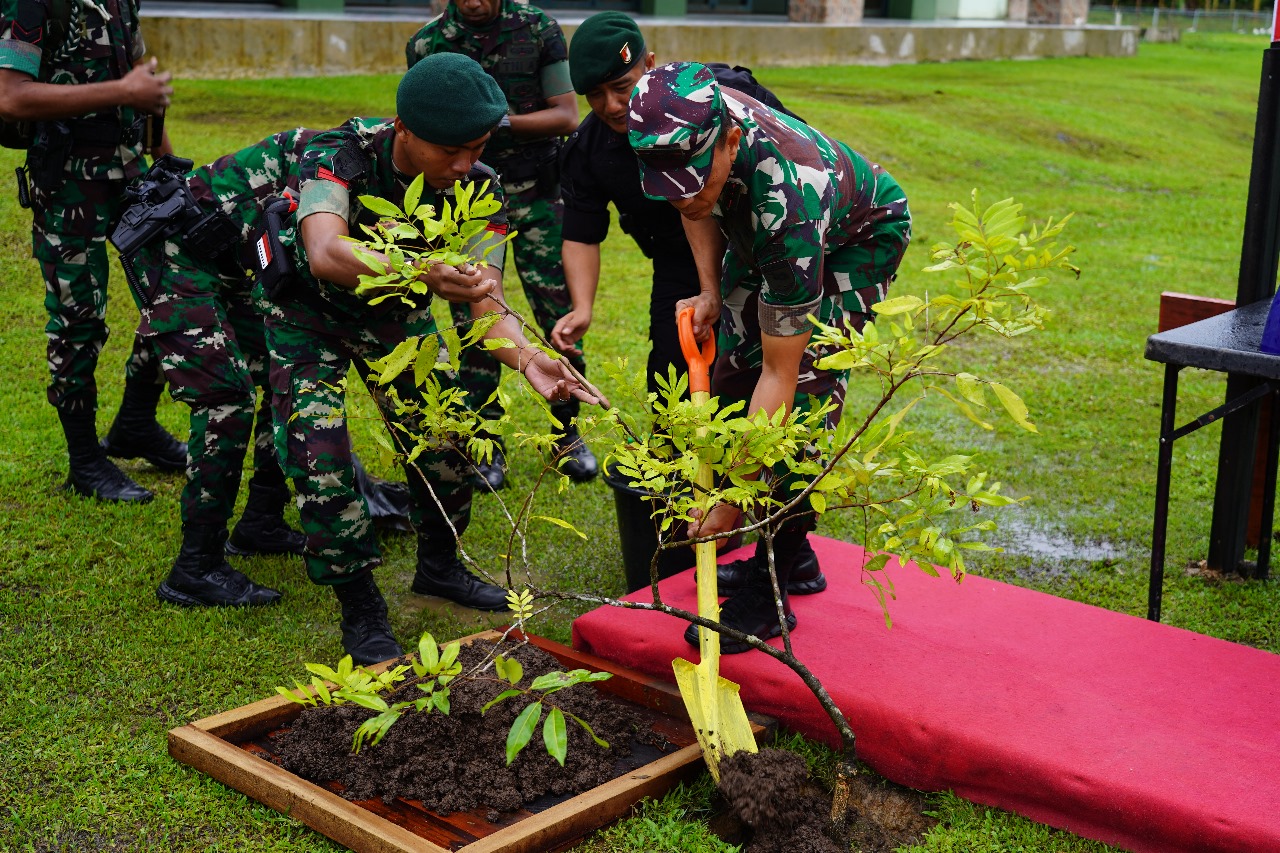 Pangdam bersama Ibu Ketua Persit melakukan penanaman pohon di sekitar lingkungan Yonif 762/VYS sebagai bentuk komitmen terhadap pelestarian alam.