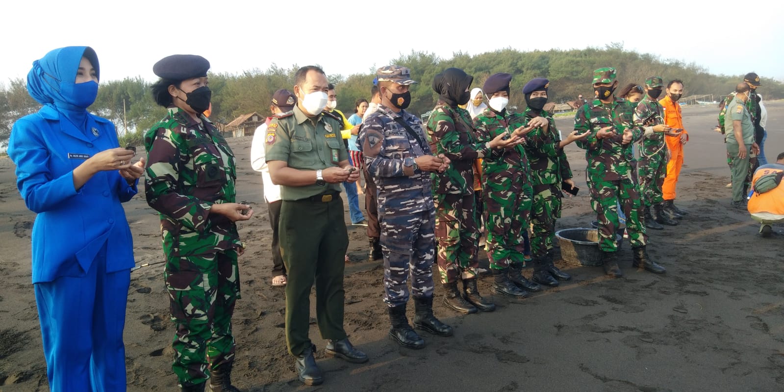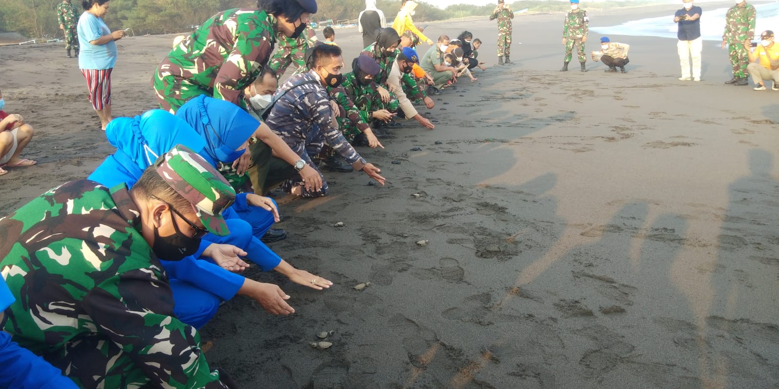 Danlanal Yogyakarta, Kolonel Laut (KH/W) Damayanti, S.H., M.M., CHRMP didampingi Paspotmar Lanal Yogyakarta, Mayor Laut (K/W) Herlin Hestiyowati, A.Md, Perwira Staf Lanal Yogyakarta dan Pejabat Ketua serta perwakilan pengurus Jalasenastri Cabang 8 Korcab V Daerah Jalasenastri Armada II, melakukan Konservasi melepaskan anak penyu kehabitat asalnya, hasil budidaya penangkaran penyu Staf Potmar Lanal Yogyakarta yang ada di Pos TNI AL Congot ke Perairan Pantai Congot, Jangkaran, Temon Kab. Kulonprogo, Senin (09/08/21).