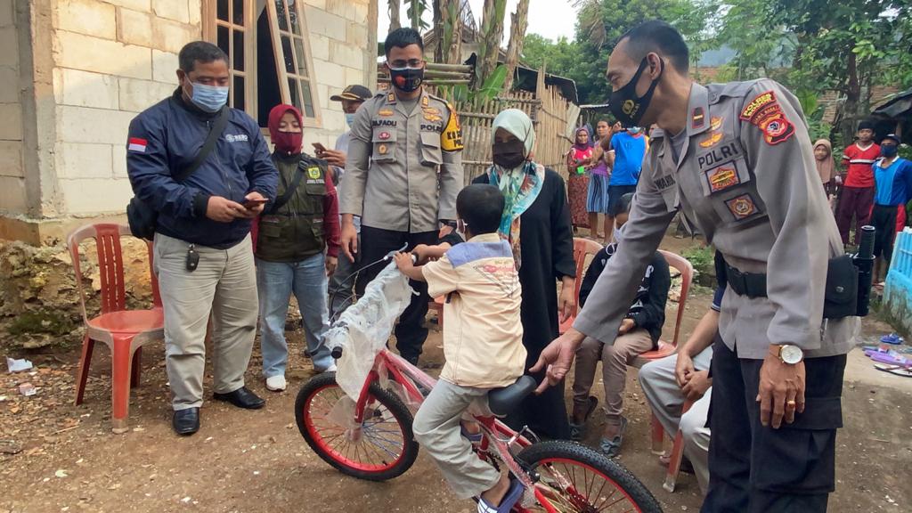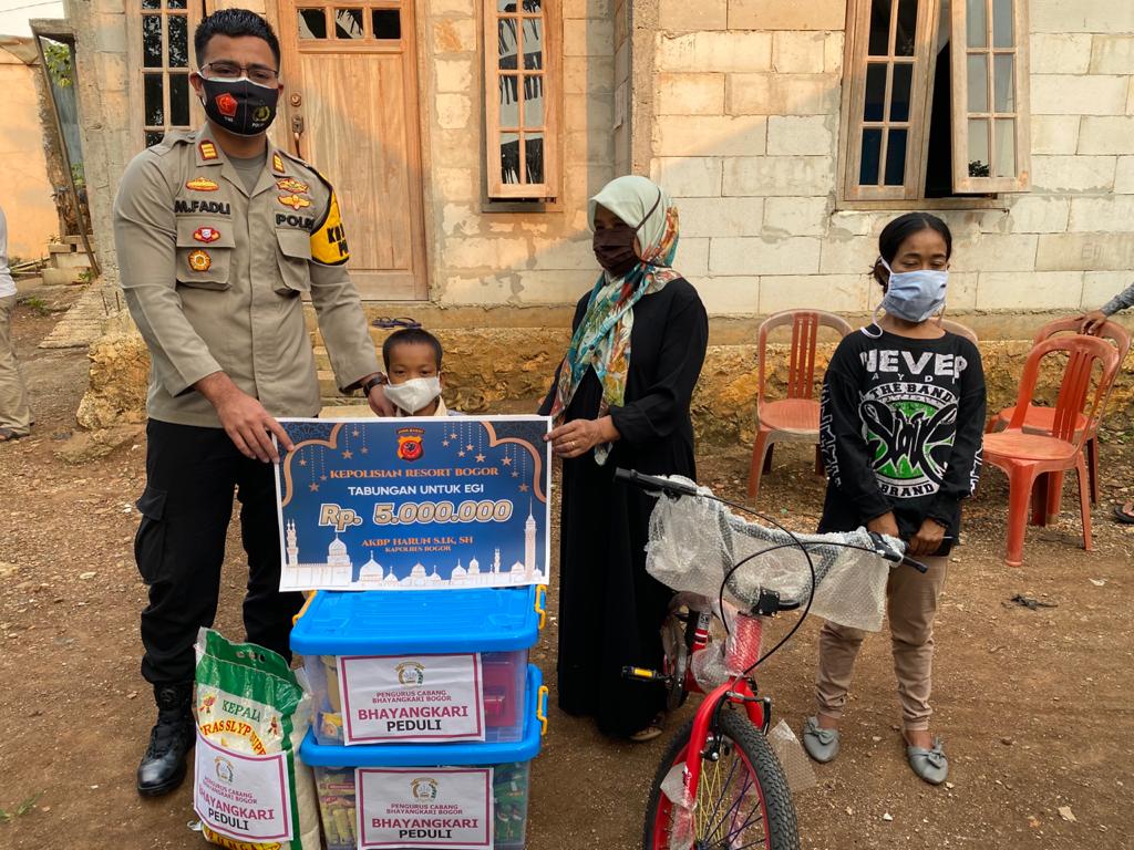 Dalam kunjungannya tersebut pun kapolsek Klapanunggal meyerahkan tali asih yang diberikan Kapolres Bogor AKBP Harun S.I.K., S.H dan bhayangkari Polres Bogor berupa Paket sembako, Sebuah sepeda, dan berupa uang tunai yang di peruntukan sebagai tabungan Egi.