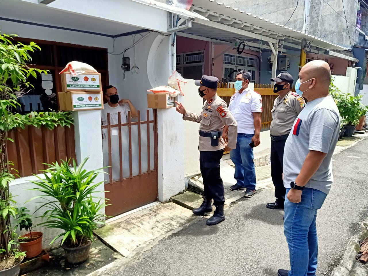 Polsek Tanjung Duren Jakarta Barat melalui Kanit Reskrim Polsek Tanjung Duren AKP Mubarak didampingi Panit Bimas Ipda Sunarno memberikan bantuan sembako kepada warga yang terpapar Covid-19, Sabtu (27/02/2021).