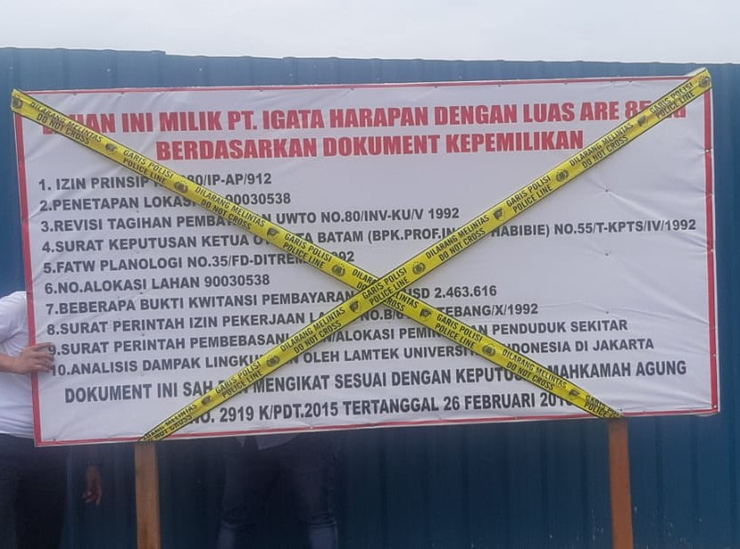 Saling klaim kepemilikan tanah dilahan Bengkong kota Batam, berbuntut pelaporan dan pemasangan police line (Garis Polisi) oleh penyidik Ditkrimum Polda Riau atas tindakan PT Igata Harapan memasang plang pemberitahuan hak tanah miliknya yang saat ini kelola oleh PT. Mitra Bintang Putra (PT. MBP) .