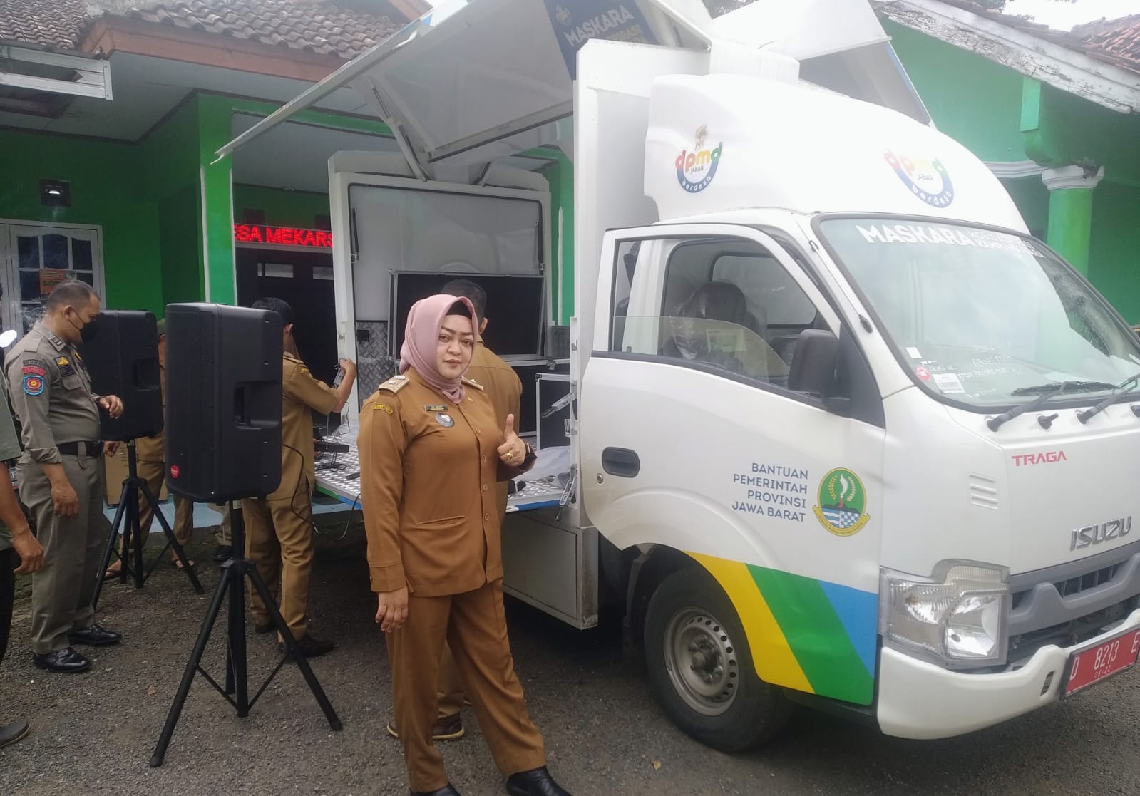 Disela-sela pemeriksaan kelengkapan Maskara, Kades Mekarsari Hj Nasih sempat berfoto dengan latar mobil barunya *Maskara* yang baru hitungan hari tiba dari Bandung dan diperlihatkan kepada perangkat Desa dan disaksikan juga oleh warga yang datang berurusan ke Kantor Desa.