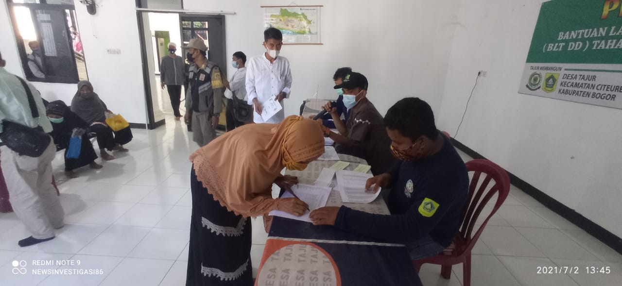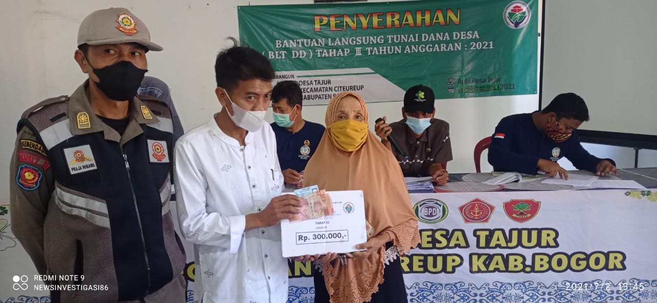 Pemerintahan Desa Tajur, Kecamatan Citeureup, Kabupaten Bogor, kembali menyalurkan Bantuan Langsung Tunai (BLT-DD) dari Dana Desa tahap ke tiga (3), yang diadakan di Aula Kantor Desa dan dihadiri oleh 64 Keluarga Penerima Manfaat (KPM) sejumlah Rp 300.000,-(Tiga ratus ribu rupiah), acara tersebut berjalan tertib dan kondusif serta menghimbau kepada keluarga penerima bantuan BLT-DD agar selalu mengutamakan protokol kesehatan untuk mencegah penyebaran Virus Covid 19, Jumat (2/7/2021).