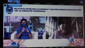 Pelatihan Keterampilan dan UMKM kali ini mengangkat materi latihan keterampilan membuat toiletris dengan hiasan biji kopi, diikuti perwakilan dari pengurus Jalasenastri seluruh Indonesia yang dibuka Ketua Umum Jalasenastri, Ny. Vero Yudo Margono.