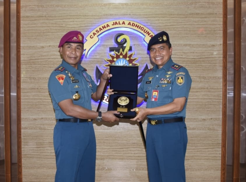 Komandan Komando Pembinaan Doktrin Pendidikan dan Latihan TNI Angkatan Laut (Dankodiklatal), Letnan Jenderal TNI (Mar) Suhartono menerima kunjungan Komandan Pusat Penerbangan TNI Angkatan Laut (Danpuspenerbal) Laksda TNI Dwika Tjahja Setiawan di Lobi Mako Kodiklatal Surabaya, Kamis (9/6/2022).