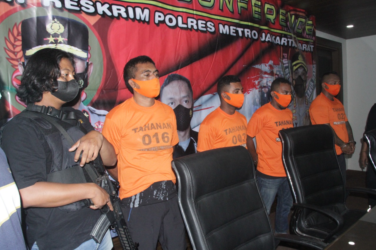 Kapolres Metro Jakarta Barat Kombes Ady Wibowo di dampingi Kapolsek Metro Taman Sari Akbp Iver soon Manosoh dan kasat reskrim Polres Metro Jakarta Barat Kompol Joko Dwi Harsono menyebut keempat tersangka yang ditahan yakni JP (46), HS (41), DT (36), FW (25). Mereka diduga mengayun-ayunkan senjata tajam dan melakukan penembakan saat peristiwa tersebut.