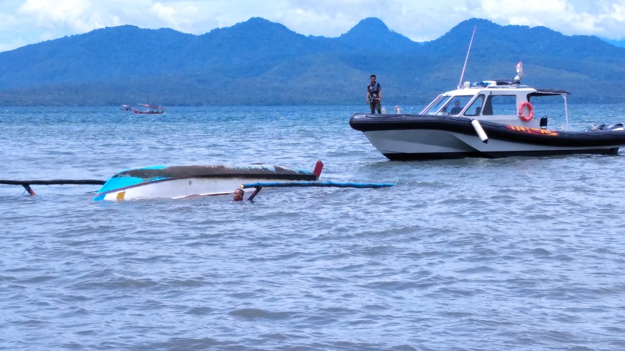 Prajurit Lanal Banyuwangi bersama Polair Polresta Banyuwangi dan masyarakat nelayan sekitar melaksanakan Search And Rescue (SAR) serta melakukan evakuasi terhadap nelayan yang mengalami insiden laka laut perahu terbalik akibat dihantam ombak disekitar Perairan Selat Bali tepatnya di depan Pantai Marina Boom Kelurahan Kampung Mandar Banyuwangi, (01/04/2023).