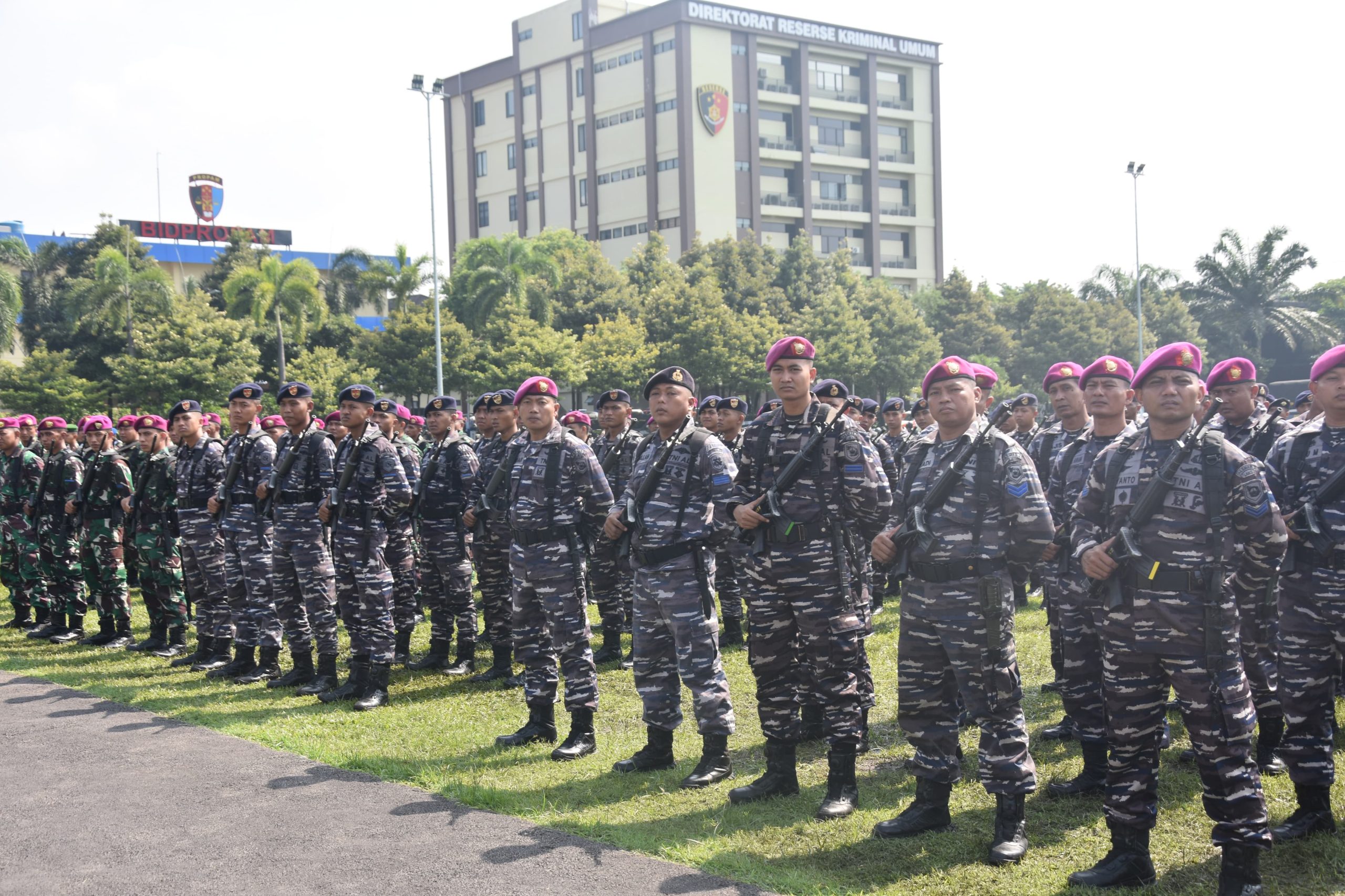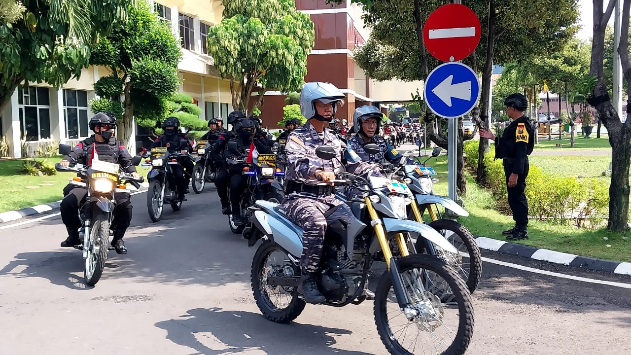 Prajurit Pangkalan Utama TNI AL (Lantamal) V mengikuti apel siaga pengamanan pemilu Tahun 2024 yang diperbantukan (BKO) ke Polda Jatim di lapangan apel Mapolda Jatim, Jl Ahmad Yani Surabaya. Selasa (13/02/2024).
