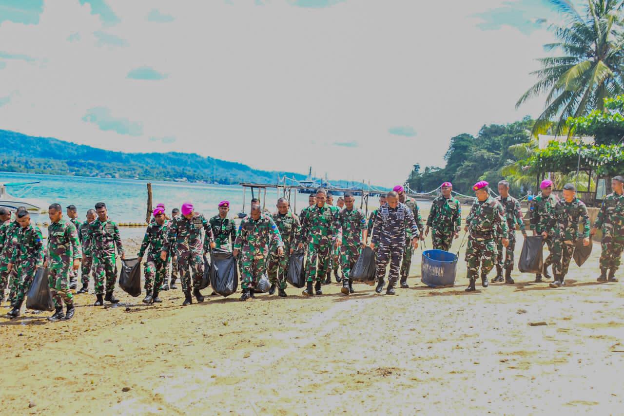 Dalam hal tersebut prajurit Yonmarhanlan IX menyisir garis pantai untuk mengumpulkan sampah plastik dan limbah rumah tangga yang terbawa arus.